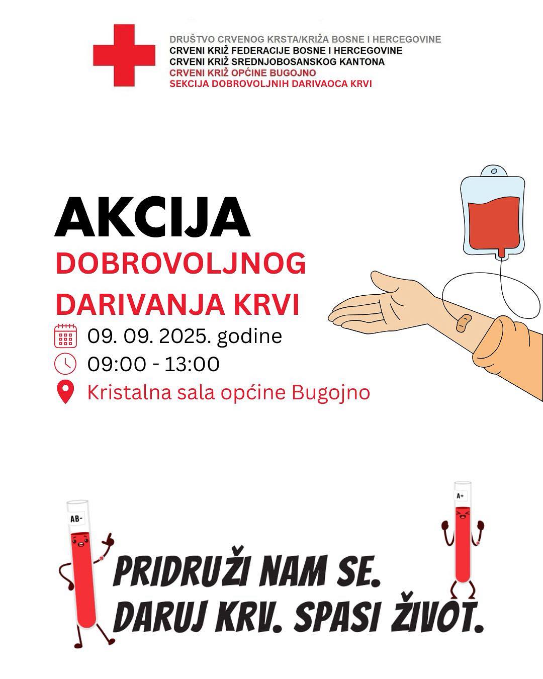 Crveni križ općine Bugojno organizuje Akciju dobrovoljnog darivanja krvi u utorak, 09. 09. 2025. godine, od 09:00 do 13:00 sati, u Kristalnoj sali općine Bugojno, na adresi 307. Motorizovane brigade.