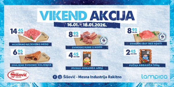 🥩❄️ VIKEND AKCIJA U MESNICAMA ŠIŠOVIĆ ❄️🥩 Vikend je savršeno vrijeme za dobar stol i provjerenu domaću kvalitetu ❤️🔥 📅 Od 16.1. do 18.1.2026. Svratite u Mesnice Šišović i iskoristite posebne vikend akcijske cijene 🛒🥩 🥩 ŠIŠOVIĆ – domaće, provjereno i s okusom tradicije ❤️🔥