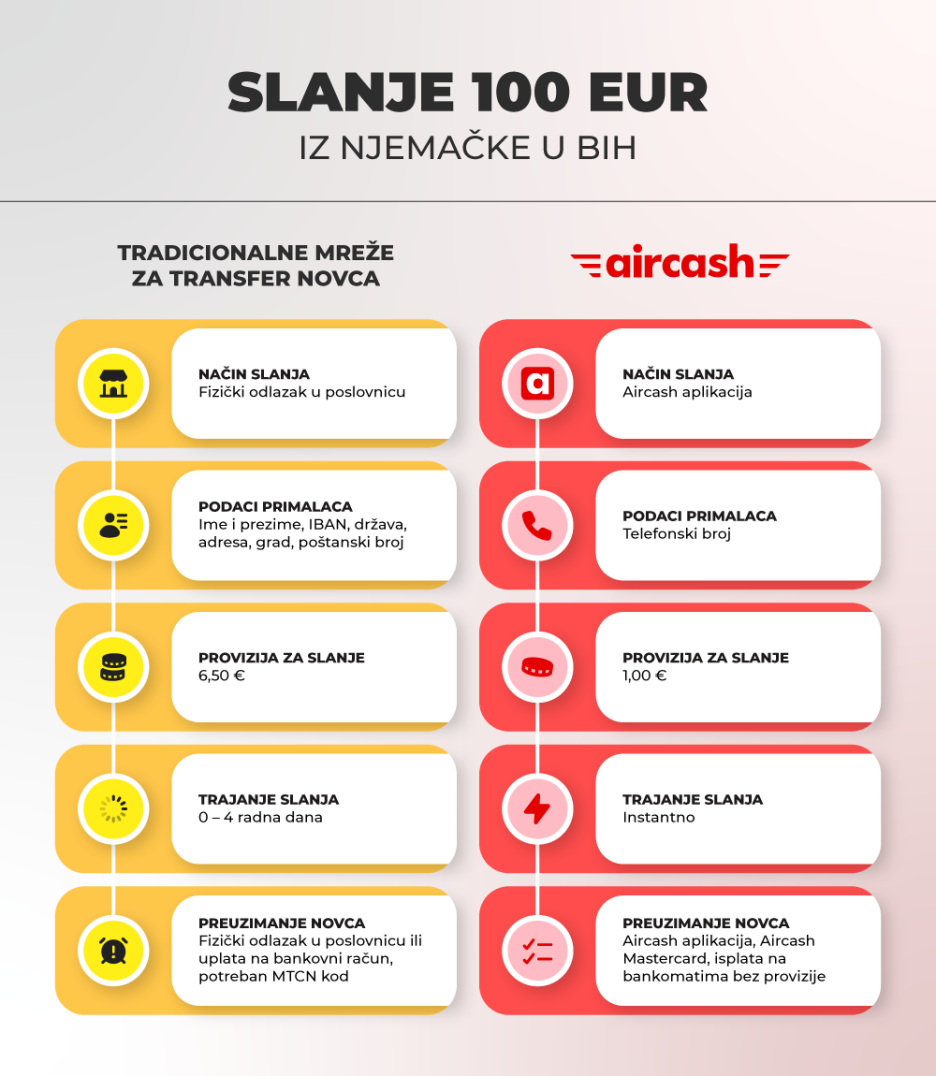 Slanje novca u Bosnu i Hercegovinu iz Austrije, Njemačke, Slovenije i ostatka Evropske unije, zahvaljujući Aircashu, moguće je obaviti u svega nekoliko koraka putem mobilne aplikacije, a nikada nije bilo brže i povoljnije.
