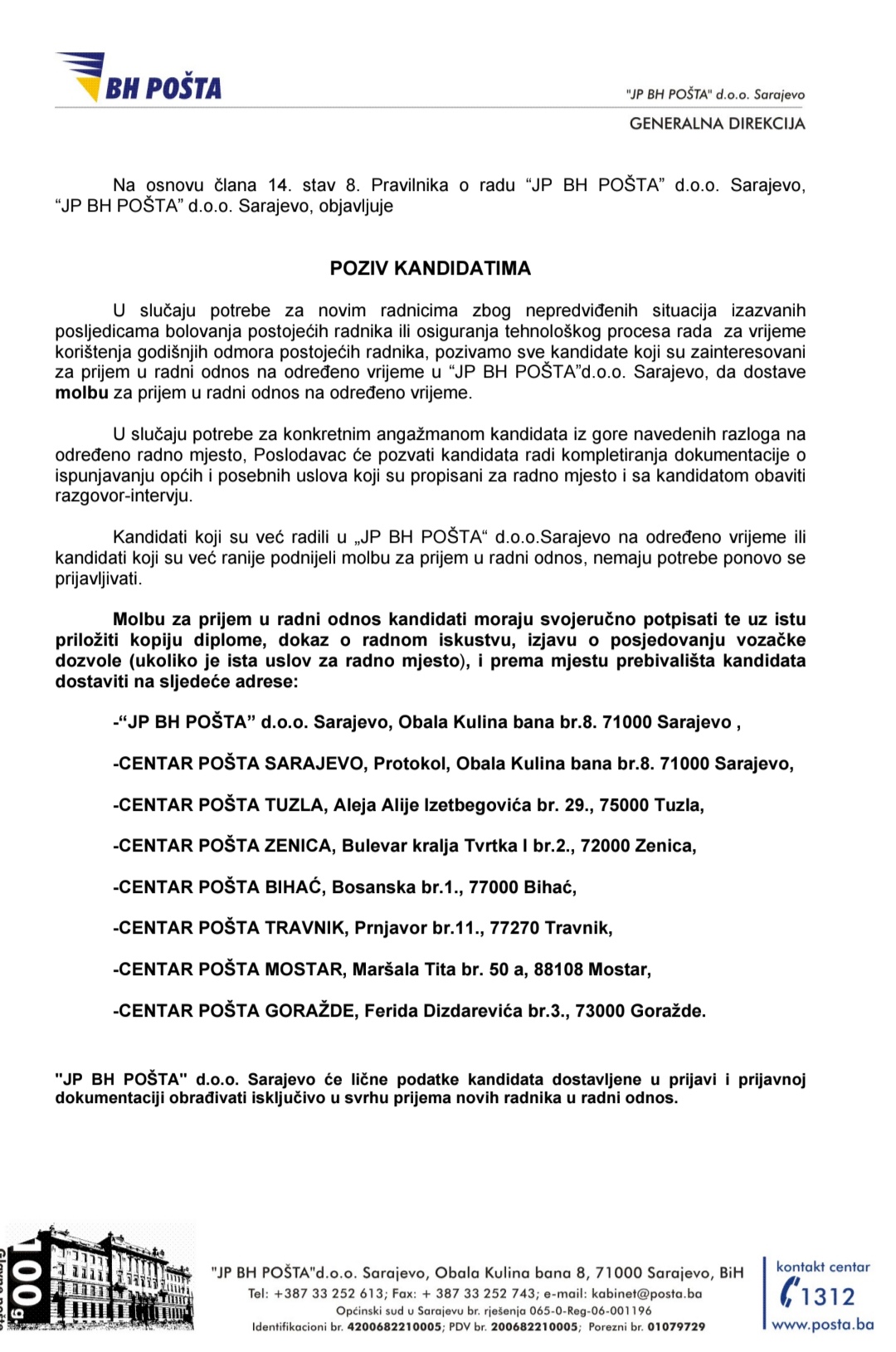 BH Pošta objavila poziv za prijavu zainteresovanih za rad na određeno vrijeme