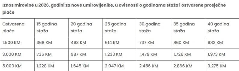 Za 40 godina staža ukoliko je plaća bila 1.500 KM, penzija će iznositi 983 KM, a ako je bila 3.000 KM bit će 1.973 KM. Međutim, ukoliko je plaća bila 5.000 KM, penzija će iznositi 3.275 KM.