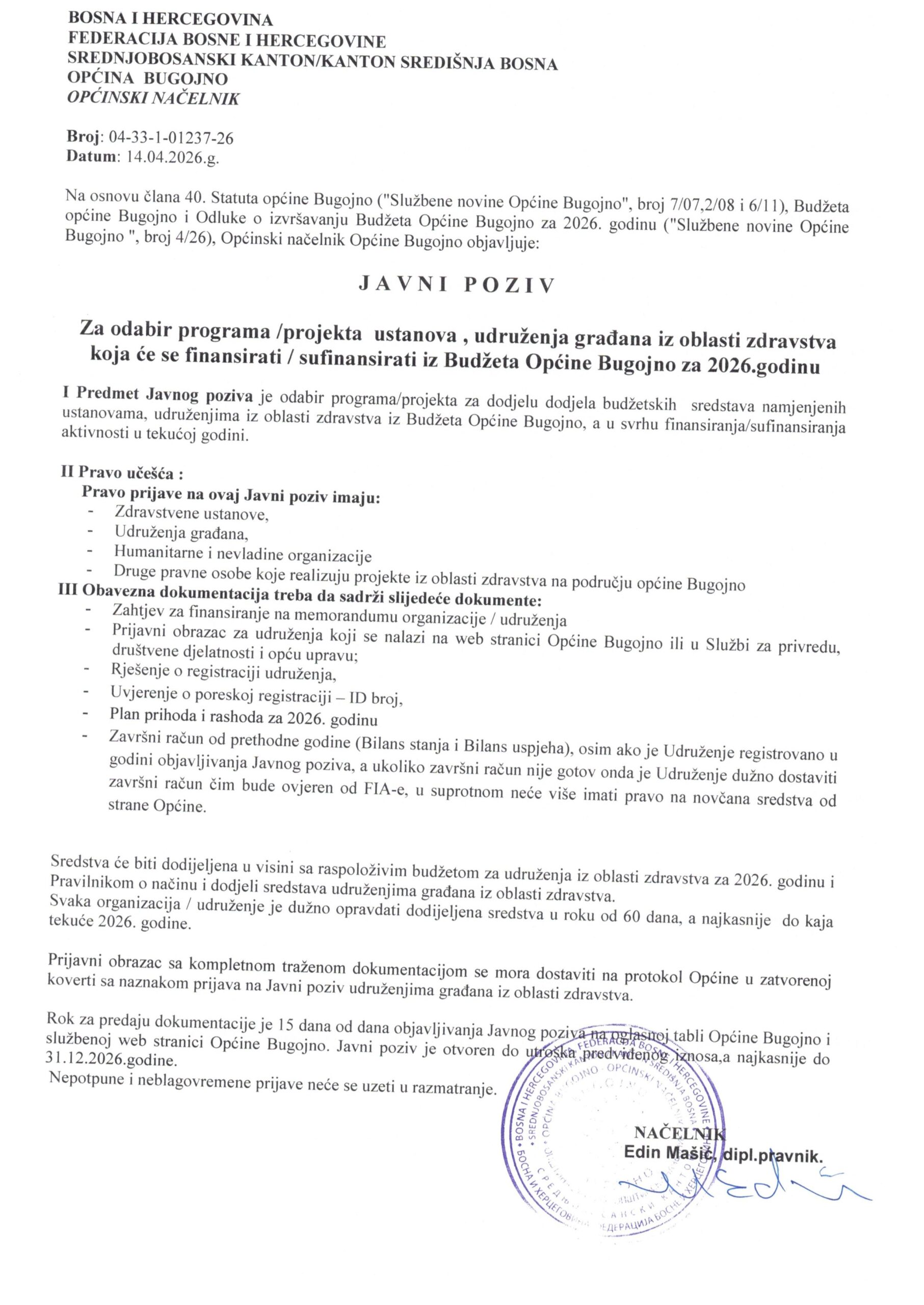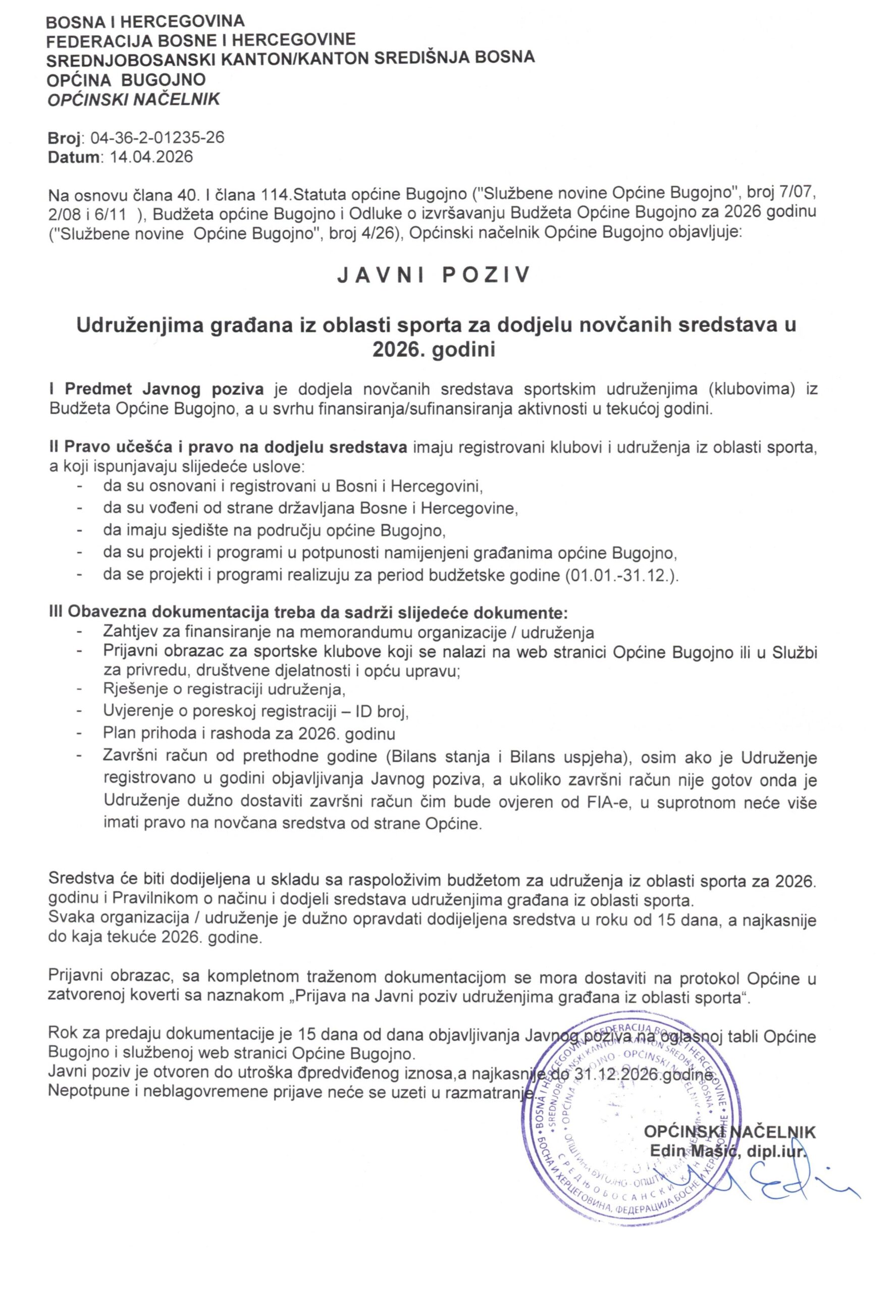 Općina Bugojno: Javni poziv za udruženja iz oblasti sporta i zdravstva