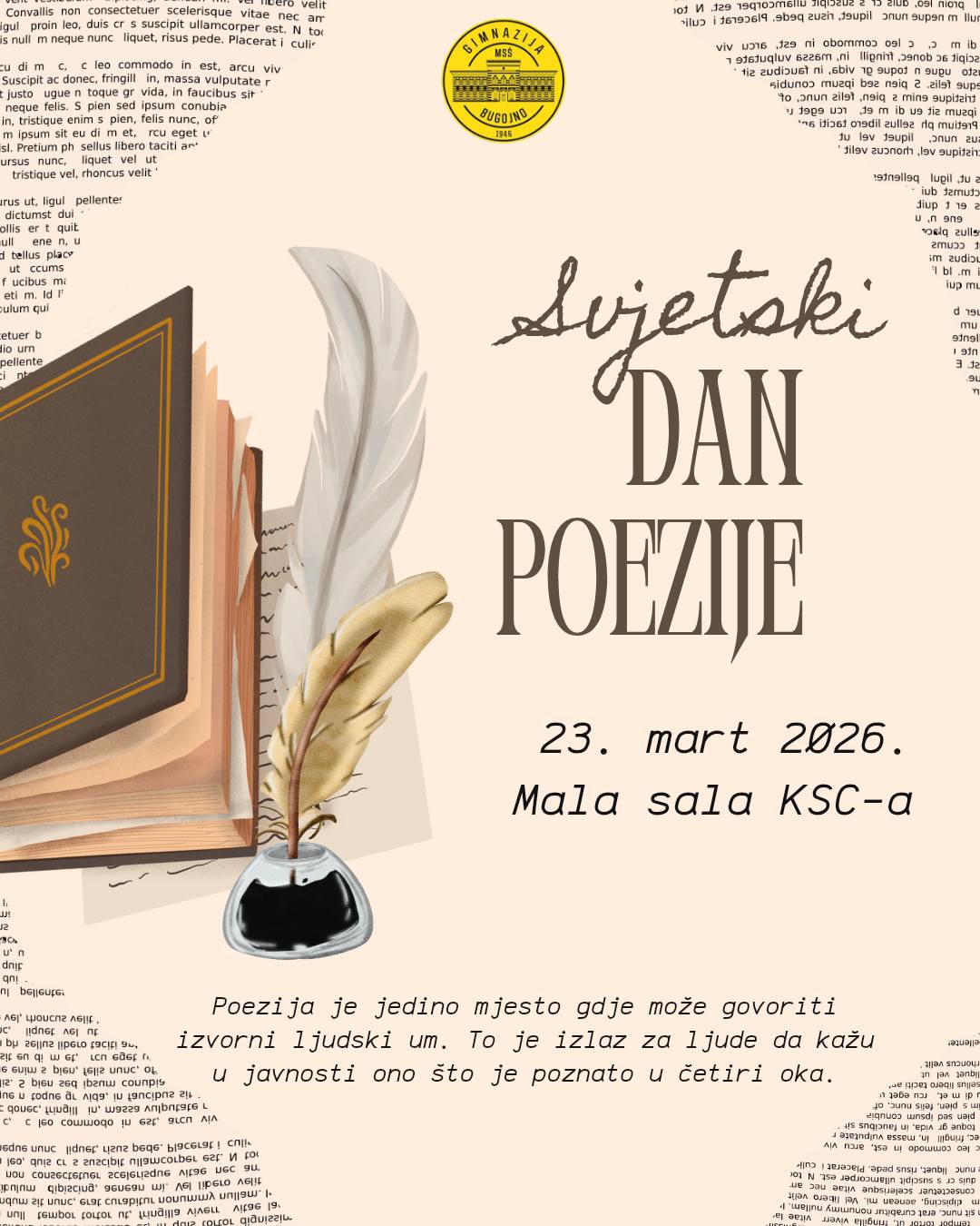 Povodom Međunarodnog dana poezije, danas je u JU Kulturno‑sportskom centru Bugojno održano takmičenje u interpretaciji poezije na općinskom nivou, u organizaciji Mješovite srednje škole „Gimnazija Bugojno“. Događaj je okupio učenike iz Srednje tehničke škole Bugojno, Srednje stručne škole Bugojno, Srednje škole „Uskoplje“ i domaćinskih gimnazijalaca, pri čemu je naglašen značaj literarne kulture i čitanja u svakodnevnom životu mladih.