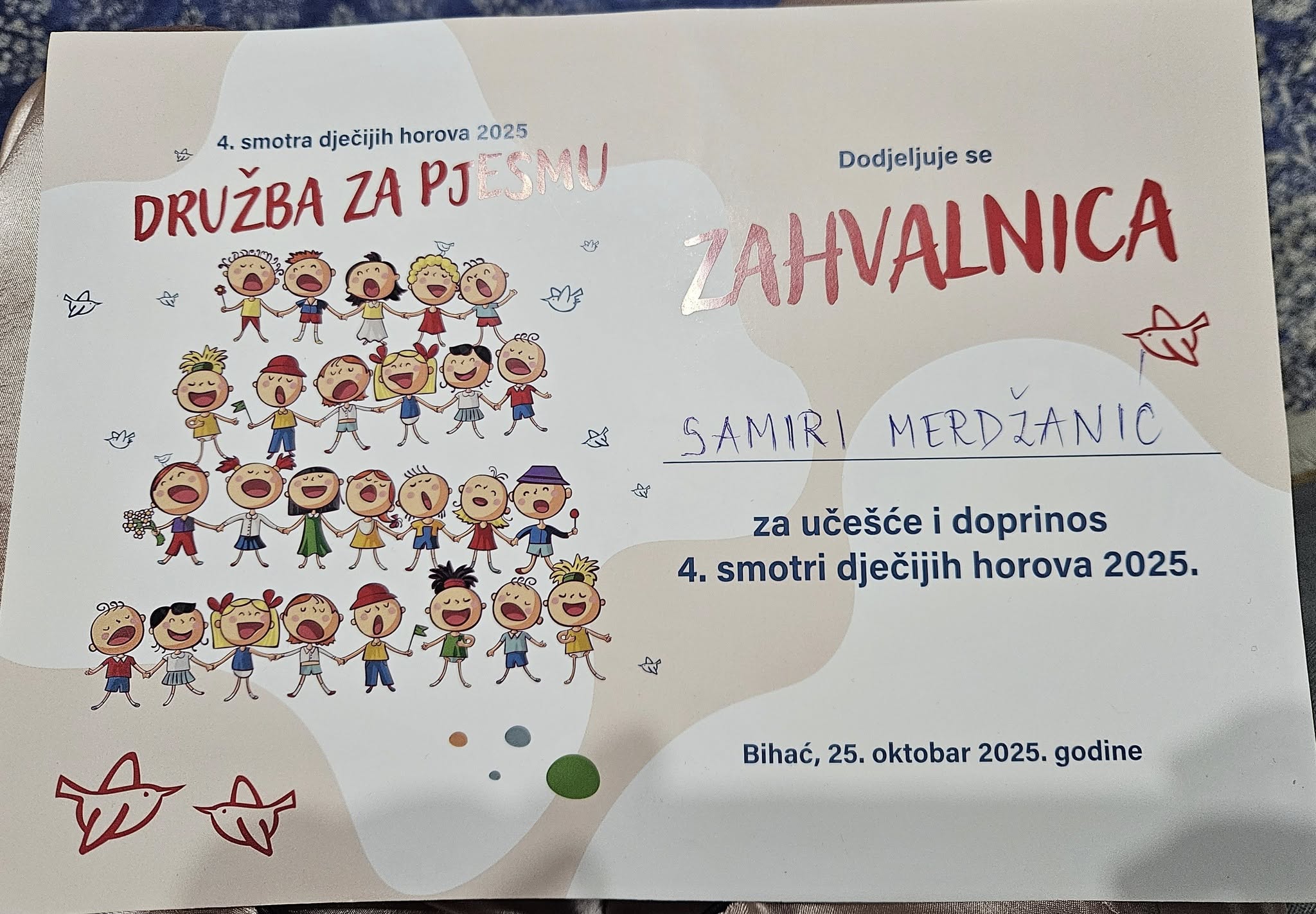 Dirigentice Alma Karabeg, Senada Mahmutspahić, Samira Merdžanić i Vesna Kečalović primile su zahvalnice za doprinos razvoju horske umjetnosti i izuzetnu posvećenost radu s djecom, publika ih je, s razlogom, nagradila dugim aplauzom. Završnica večeri bila je pravi muzički zagrljaj, gdje su svi horovi i publika zajedno otpjevali pjesmu „Pjevat ćemo šta nam srce zna“, pretvarajući dvoranu u zagrljaj emocije, glasova i ljepote pjesme.