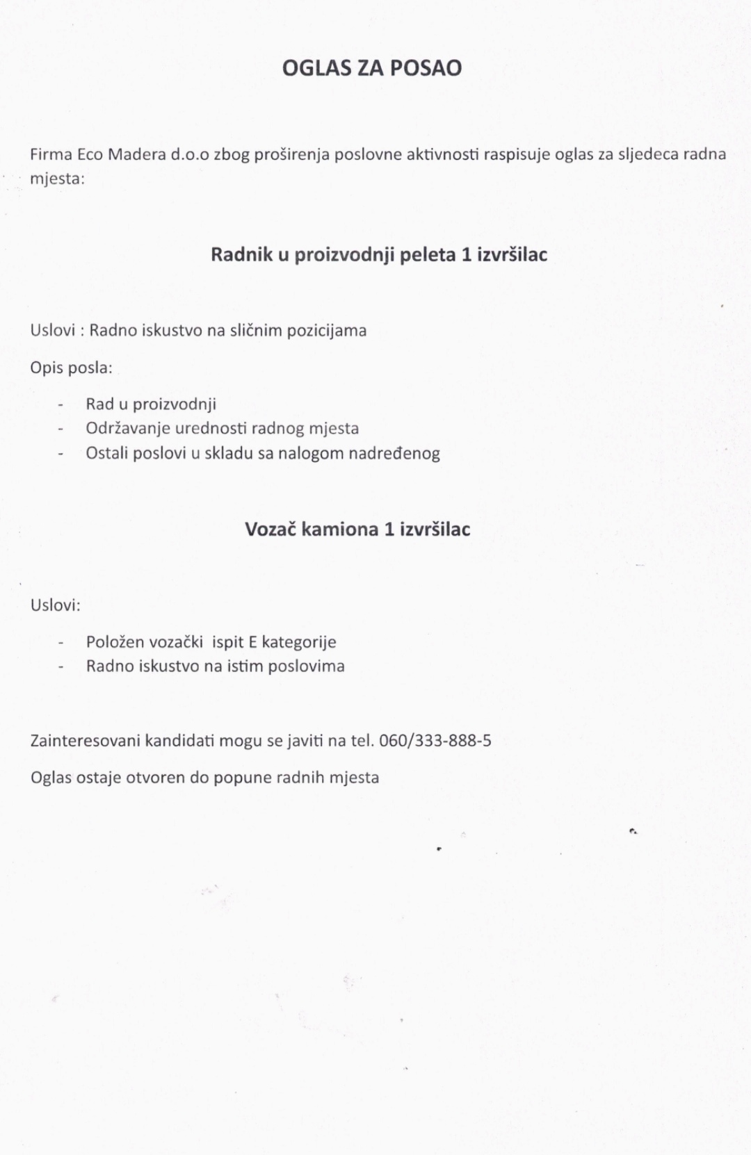 Eco Madera d.o.o. Bugojno: Oglas za posao