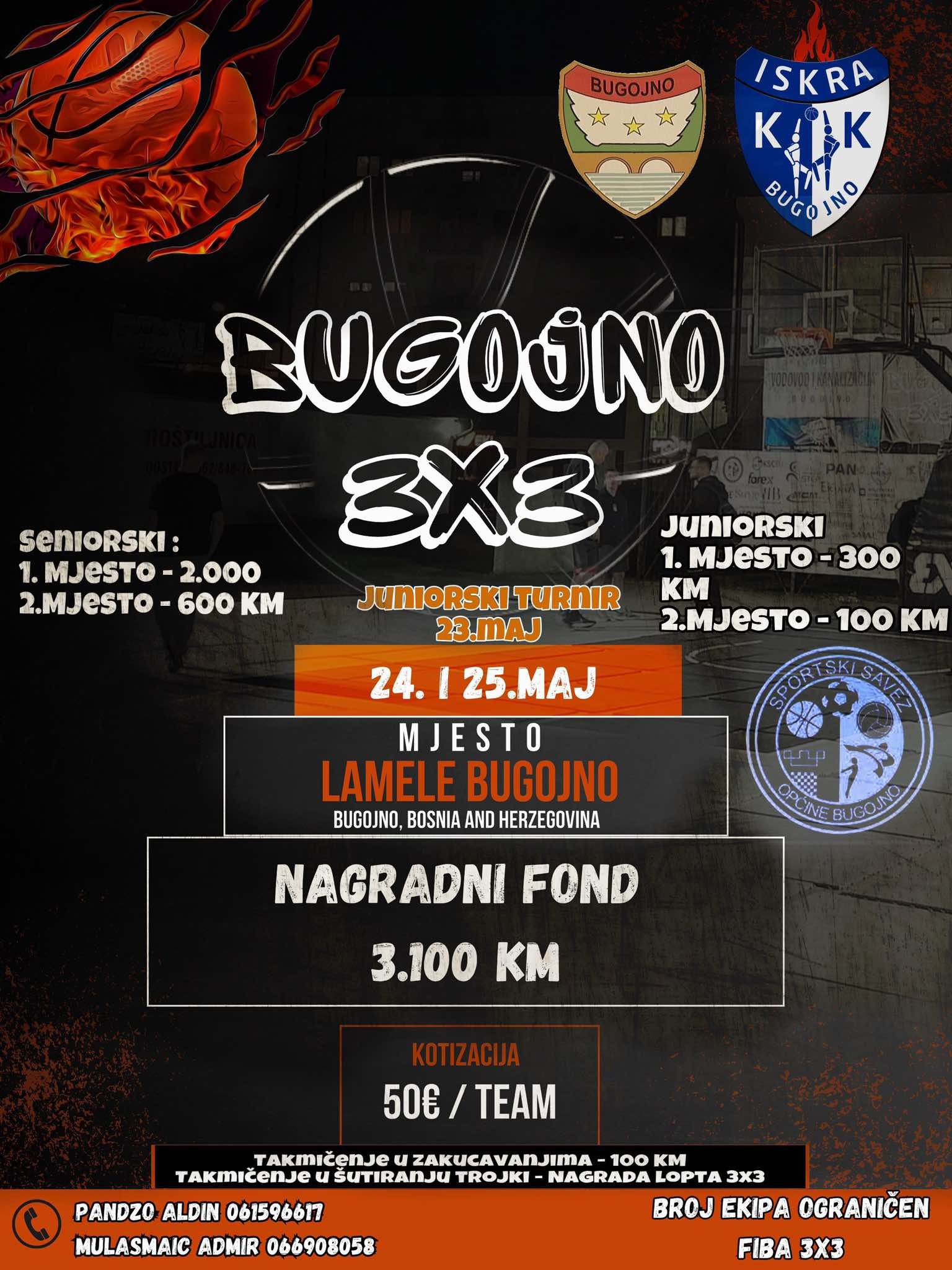 Poštovani ljubitelji basketa zadovoljstvo nam je obavijestiti vas da Sportski savez općine Bugojno uz tehničku podršku Košarkaškog kluba Iskra Bugojno a u sklopu dana Općine Bugojno i ove godine po drugi put u našem gradu organizuje Fiba 3×3 streetball turnir BUGOJNO PAN 3×3 koji će se održati 24 i 25.05.2025. godine na dobro poznatom basket terenu u Lamelama.
