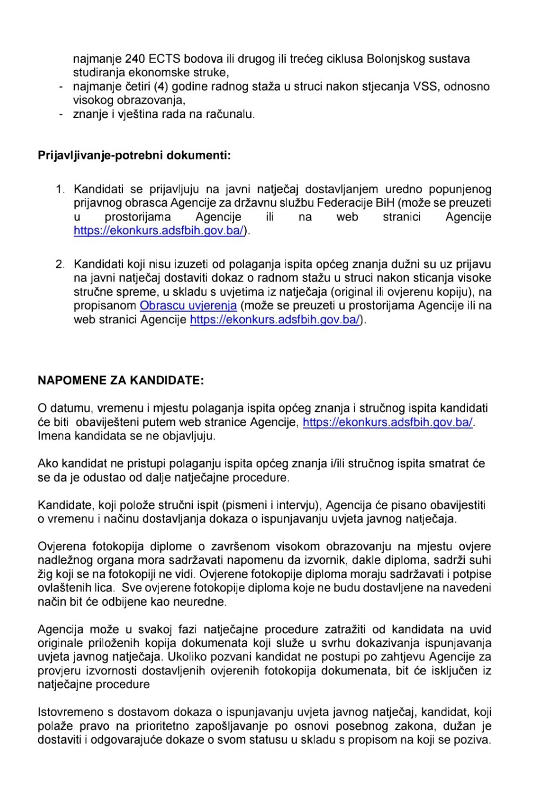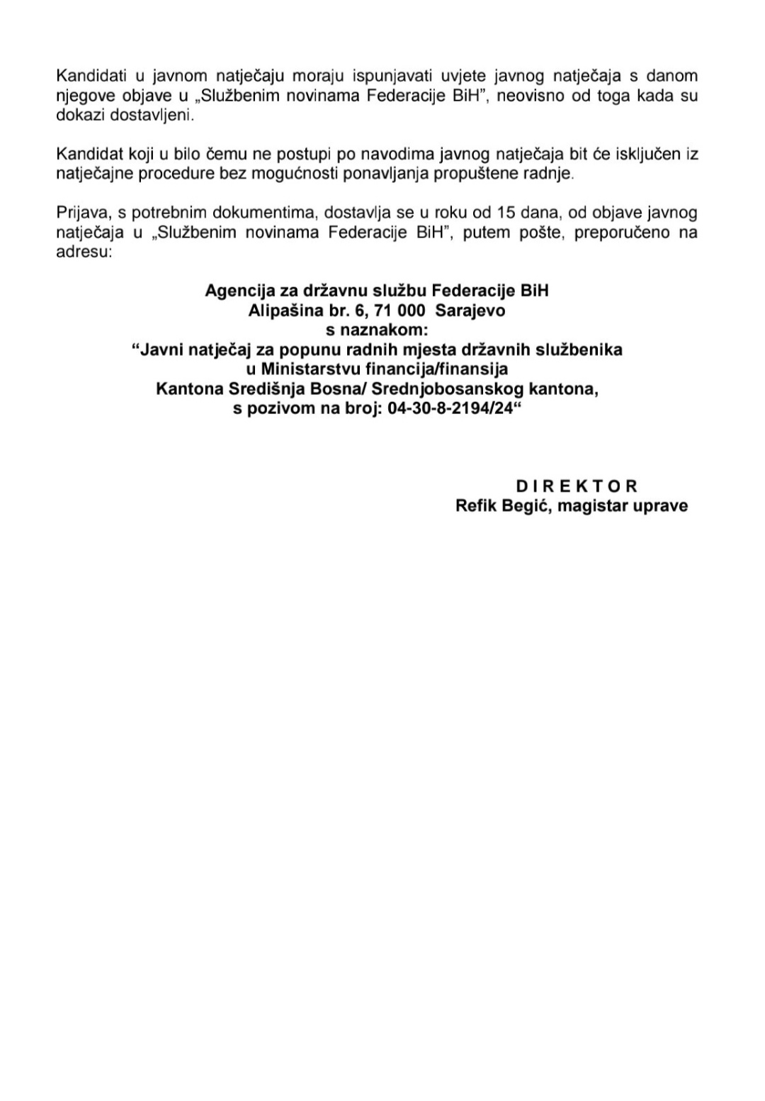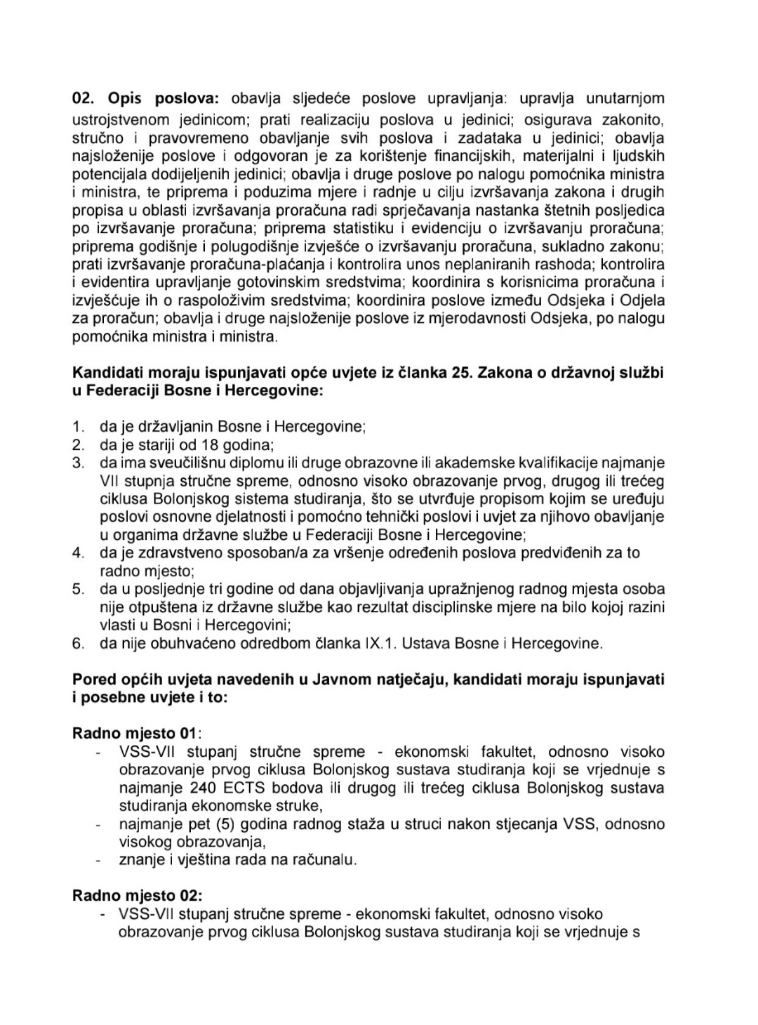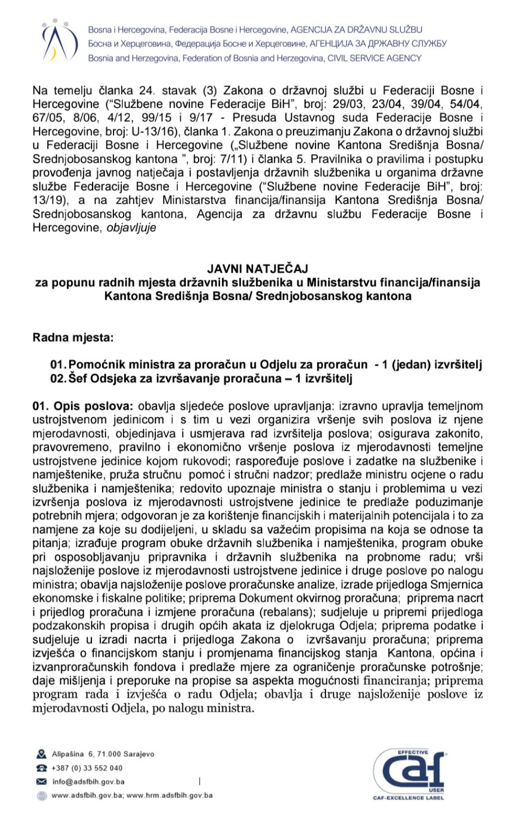 Javni konkurs za popunu radnih mjesta državnih službenika u Ministarstvu finansija SBK