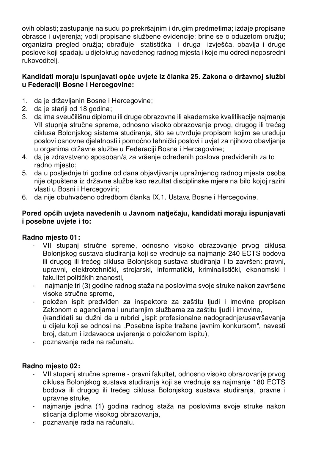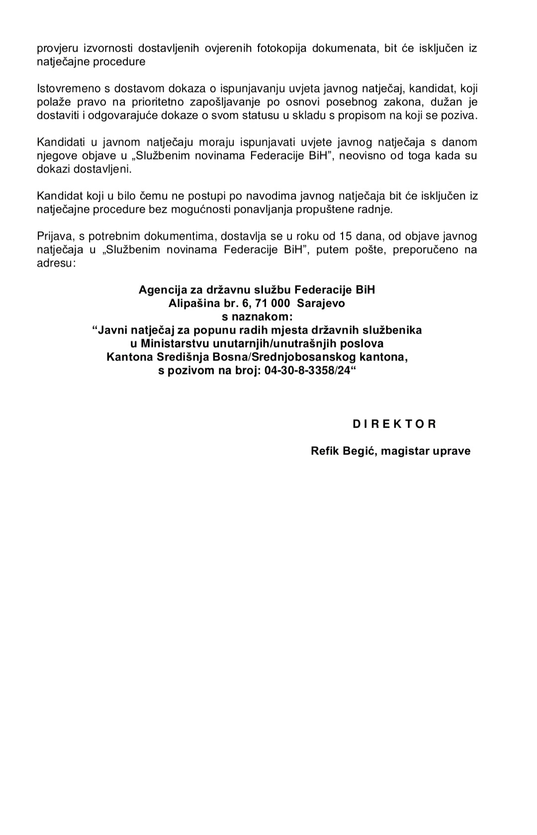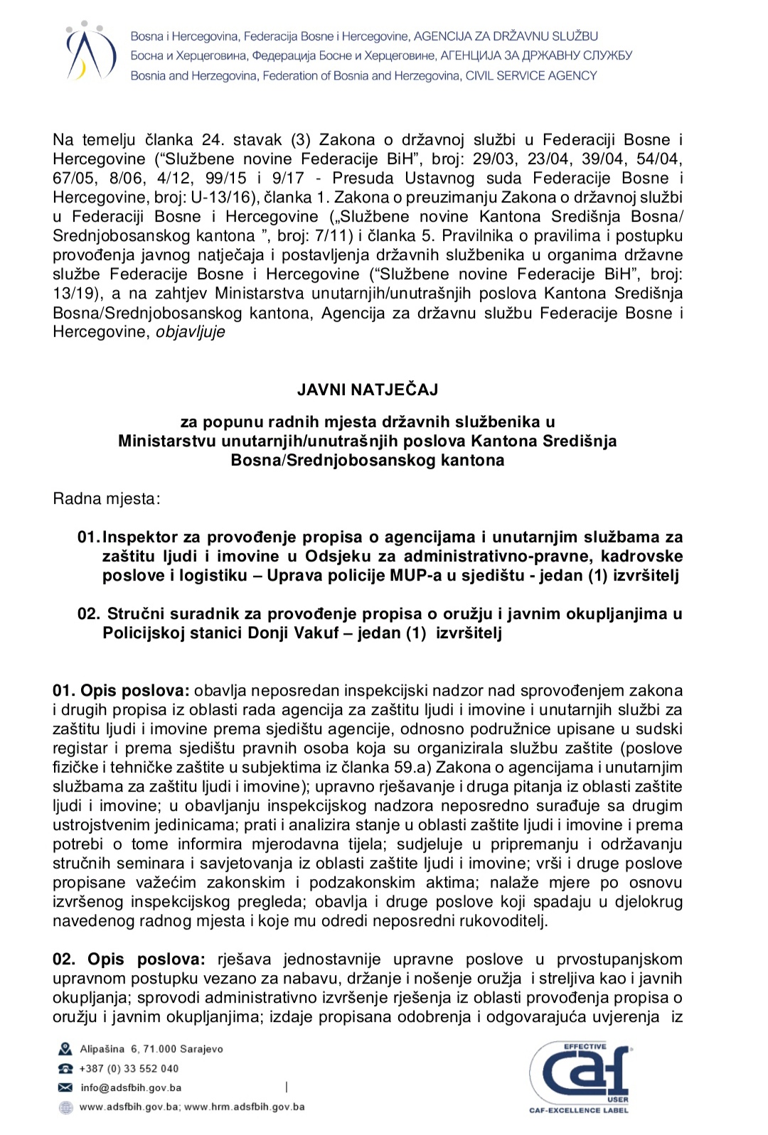 Javni konkurs za popunu radnih mjesta državnih službenika u Ministarstvu unutrašnjih poslova Srednjobosanskog kantona