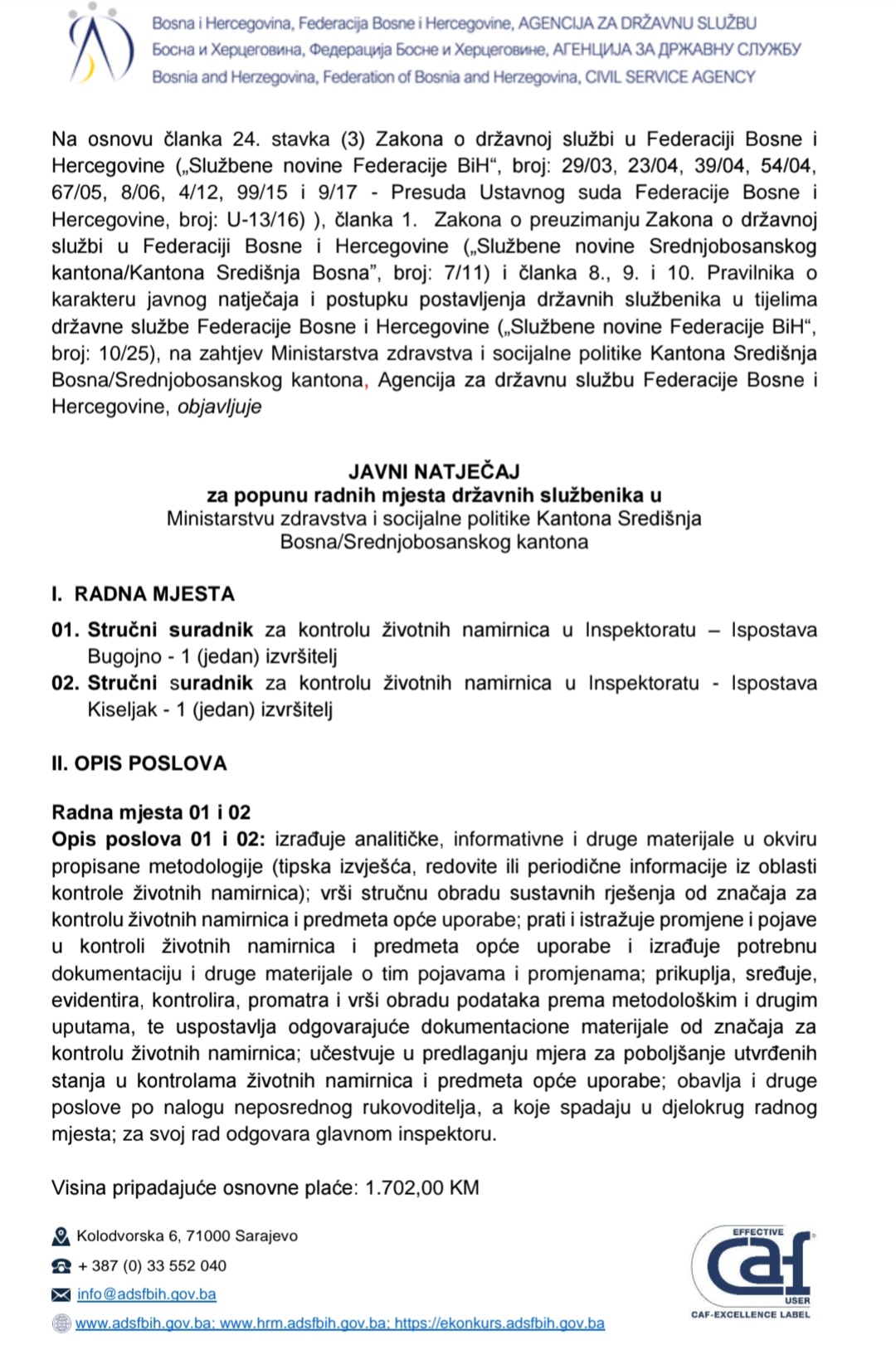 Javni konkurs za popunu radnih mjesta državnih službenika u Ministarstvu zdravstva i socijalne politike SBK