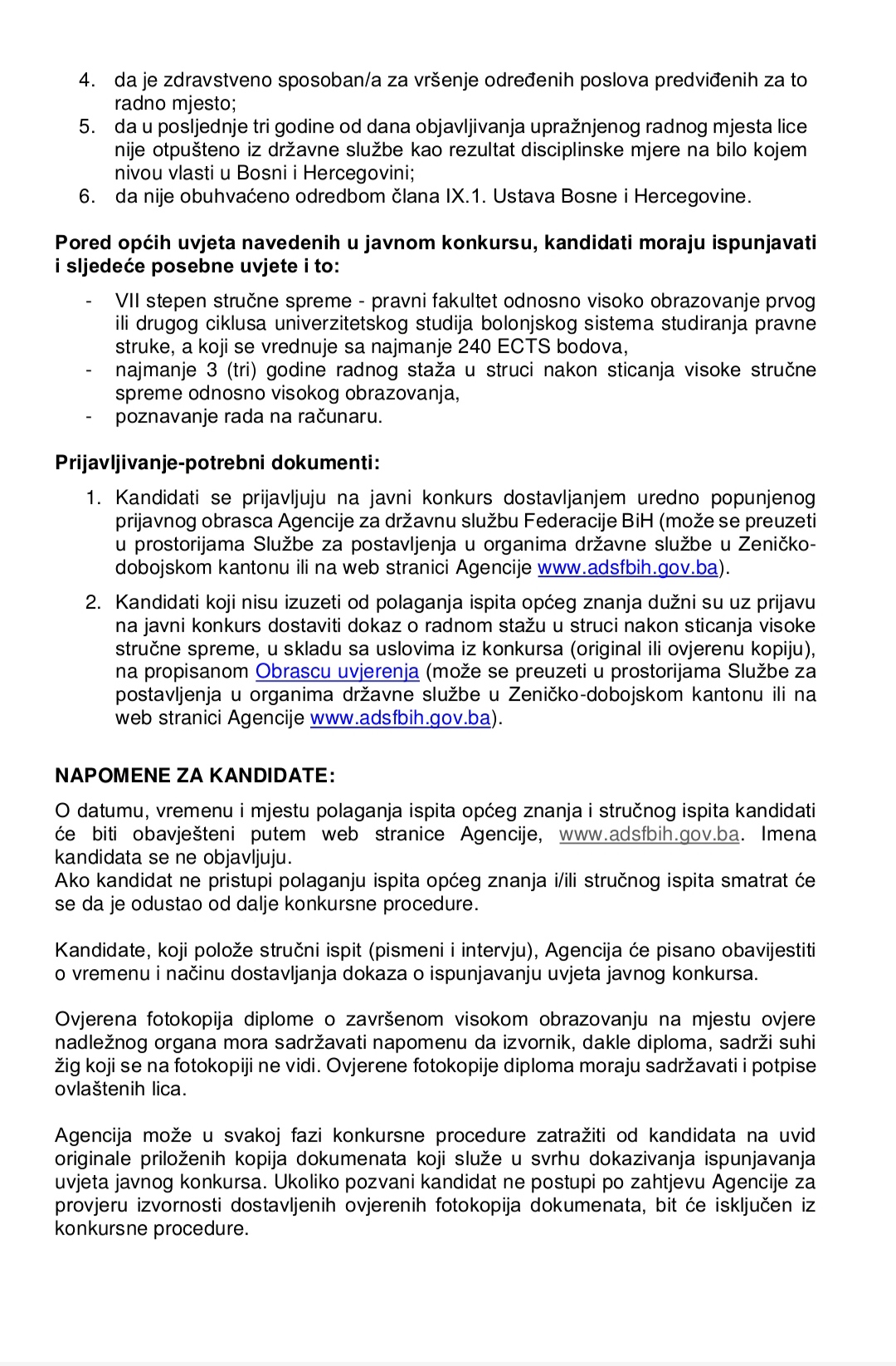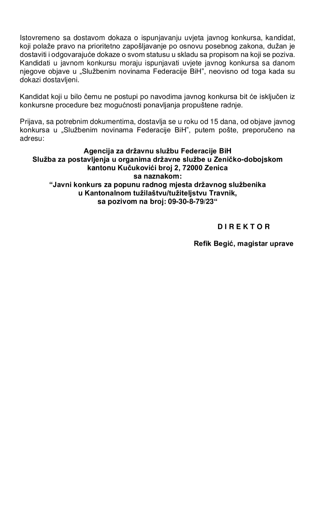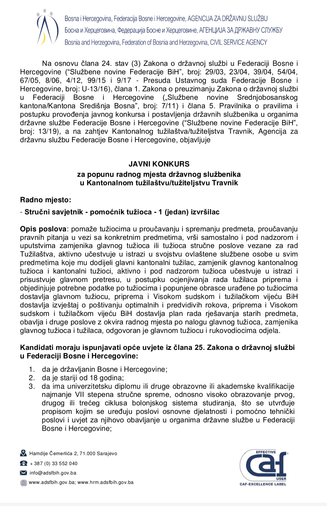Javni konkurs za popunu radnog mjesta državnog službenika u Kantonalnom tužilaštvu/tužiteljstvu Travnik