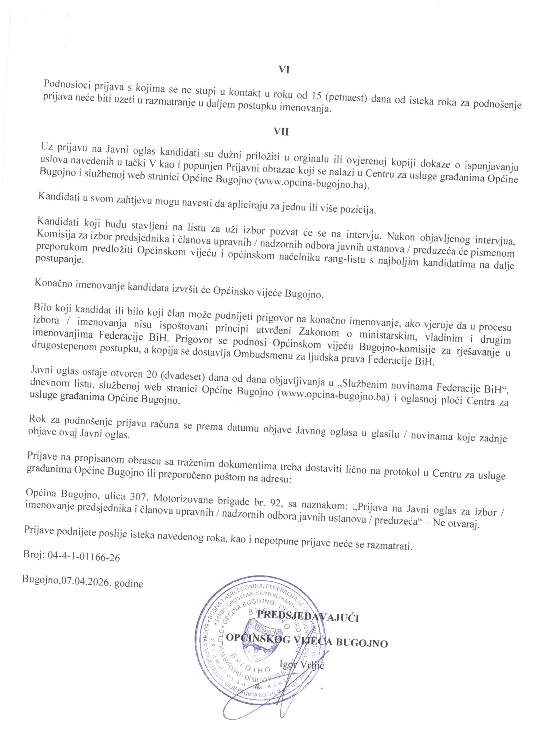 Općina Bugojno, ulica 307. Motorizovane brigade br. 92, sa naznakom: „Prijava na Javni oglas za izbor / imenovanje predsjednika i članova upravnih / nadzornih odbora javnih ustanova / preduzeća“ – Ne otvaraj.