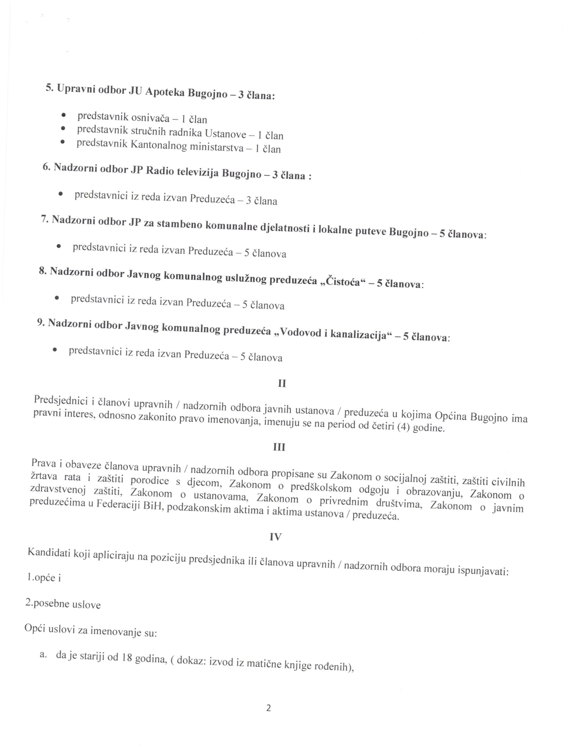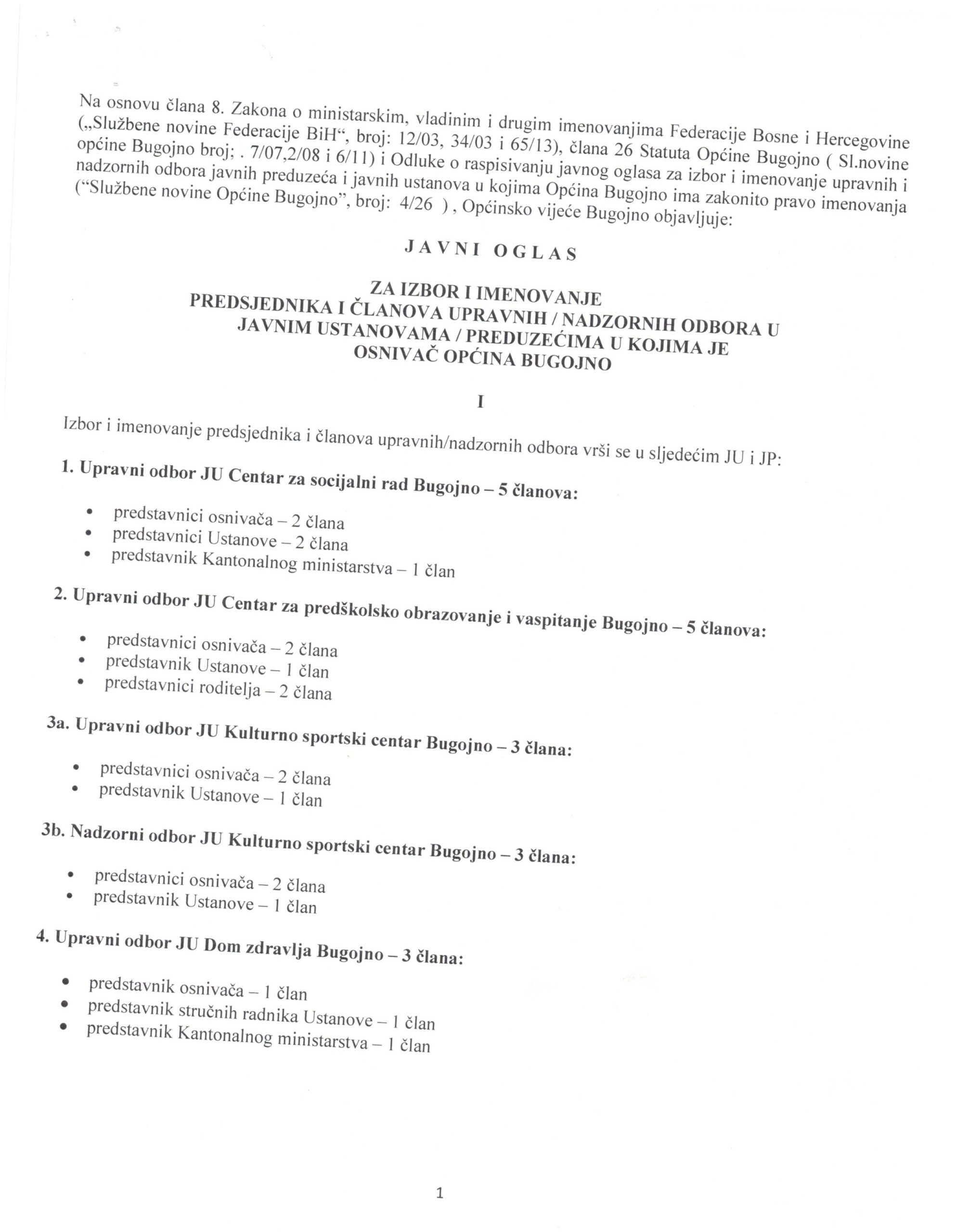 Na osnovu člana 8. Zakona o ministarskim, vladinim i drugim imenovanjima Federacije Bosne i Hercegovine („Službene novine Federacije BiH“, broj: 12/03, 34/03 i 65/13), člana 26 Statuta Općine Bugojno ( Sl.novine općine Bugojno broj; . 7/07,2/08 i 6/11) i Odluke o raspisivanju javnog oglasa za izbor i imenovanje upravnih i nadzornih odbora javnih preduzeća i javnih ustanova u kojima Općina Bugojno ima zakonito pravo imenovanja (“Službene novine Općine Bugojno”, broj: 4/26 ) , Općinsko vijeće Bugojno objavljuje: