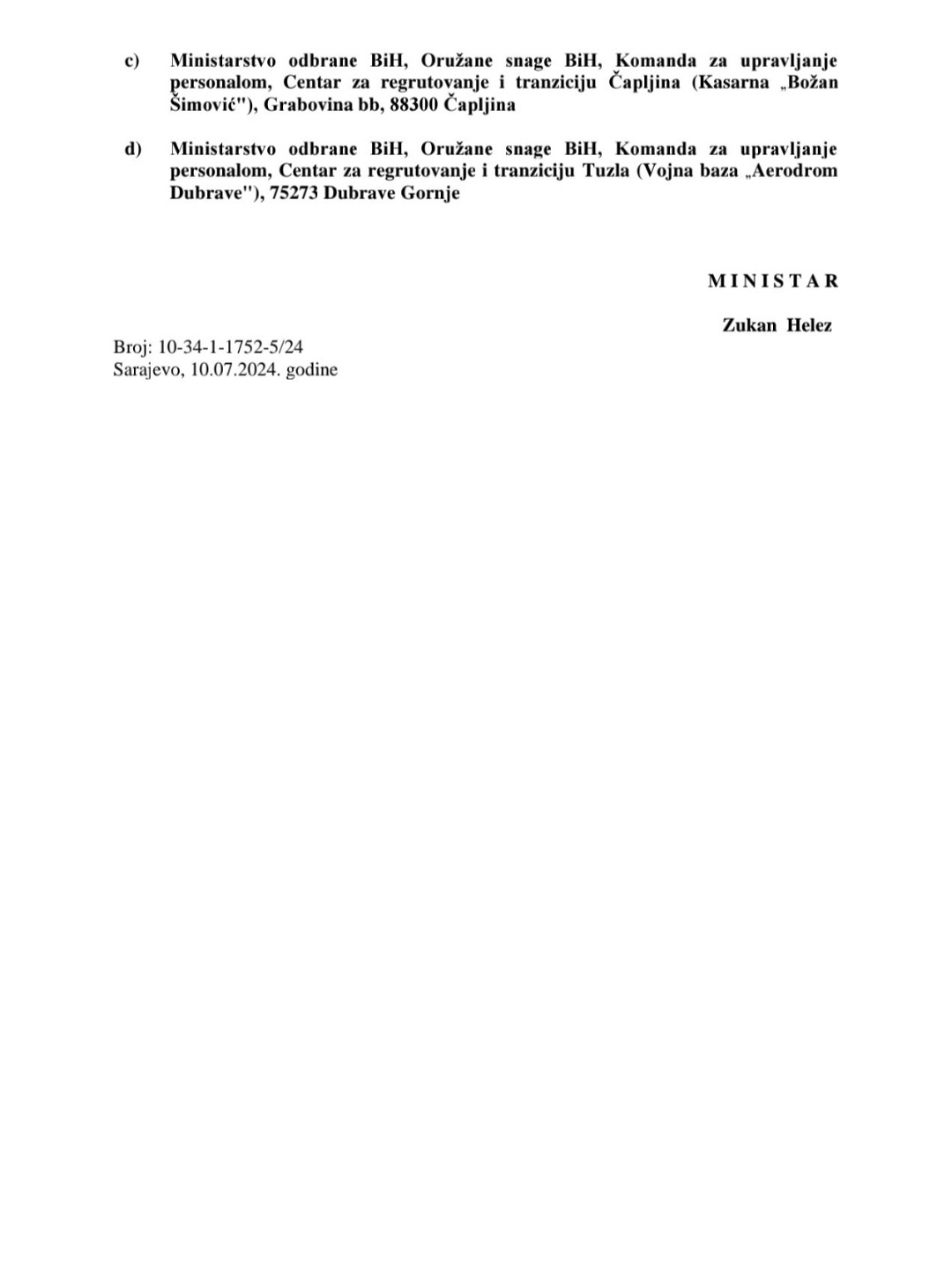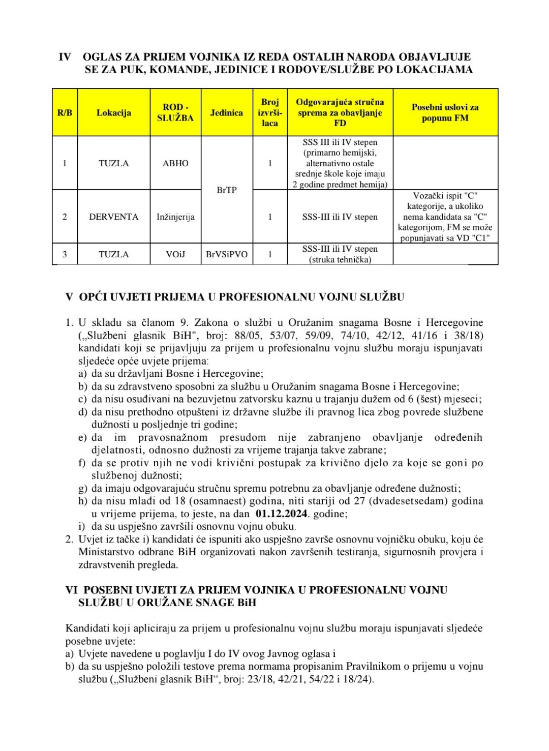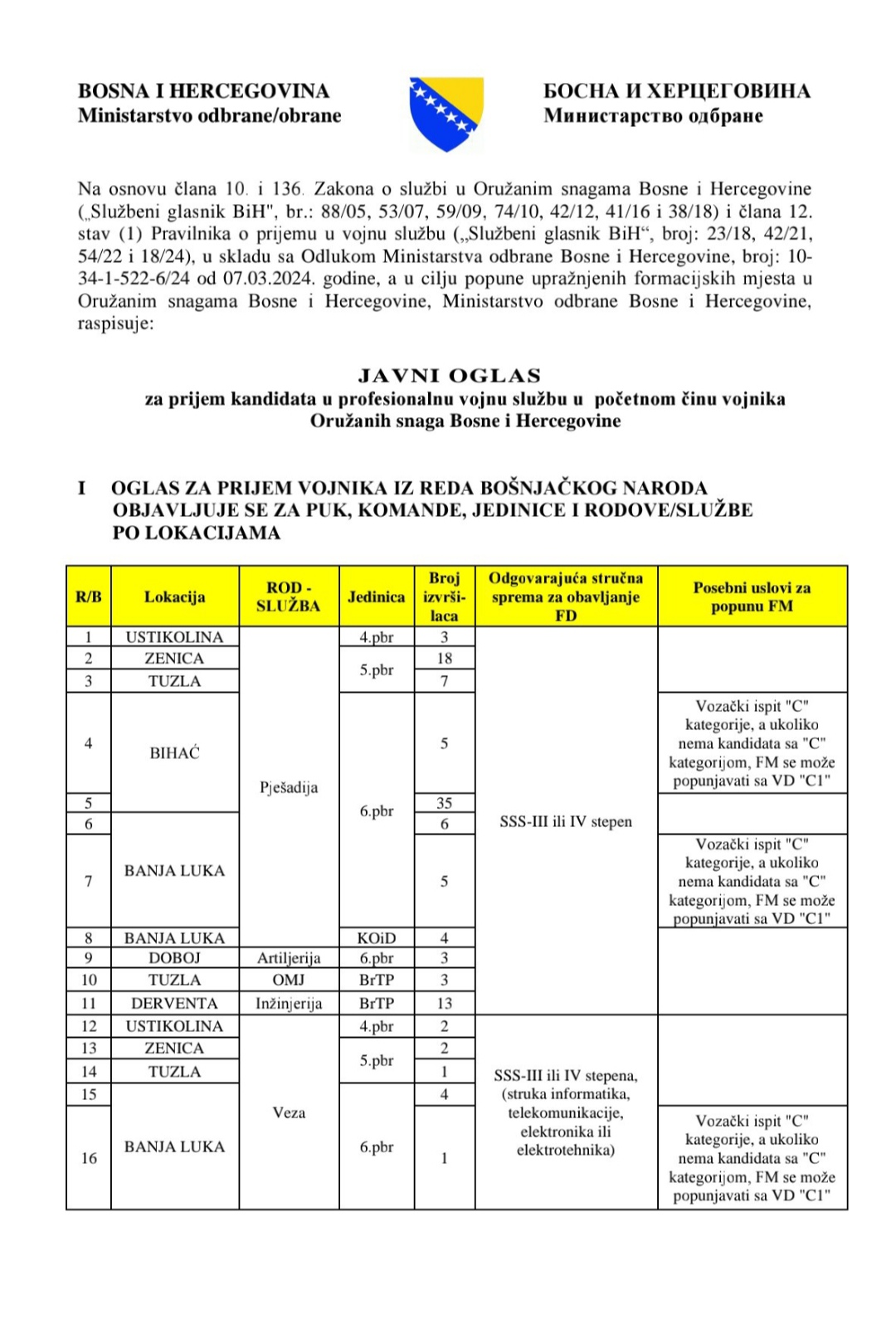 Javni oglas za prijem kandidata u profesionalnu vojnu službu u početnom činu vojnika Oružanih snaga Bosne i Hercegovine