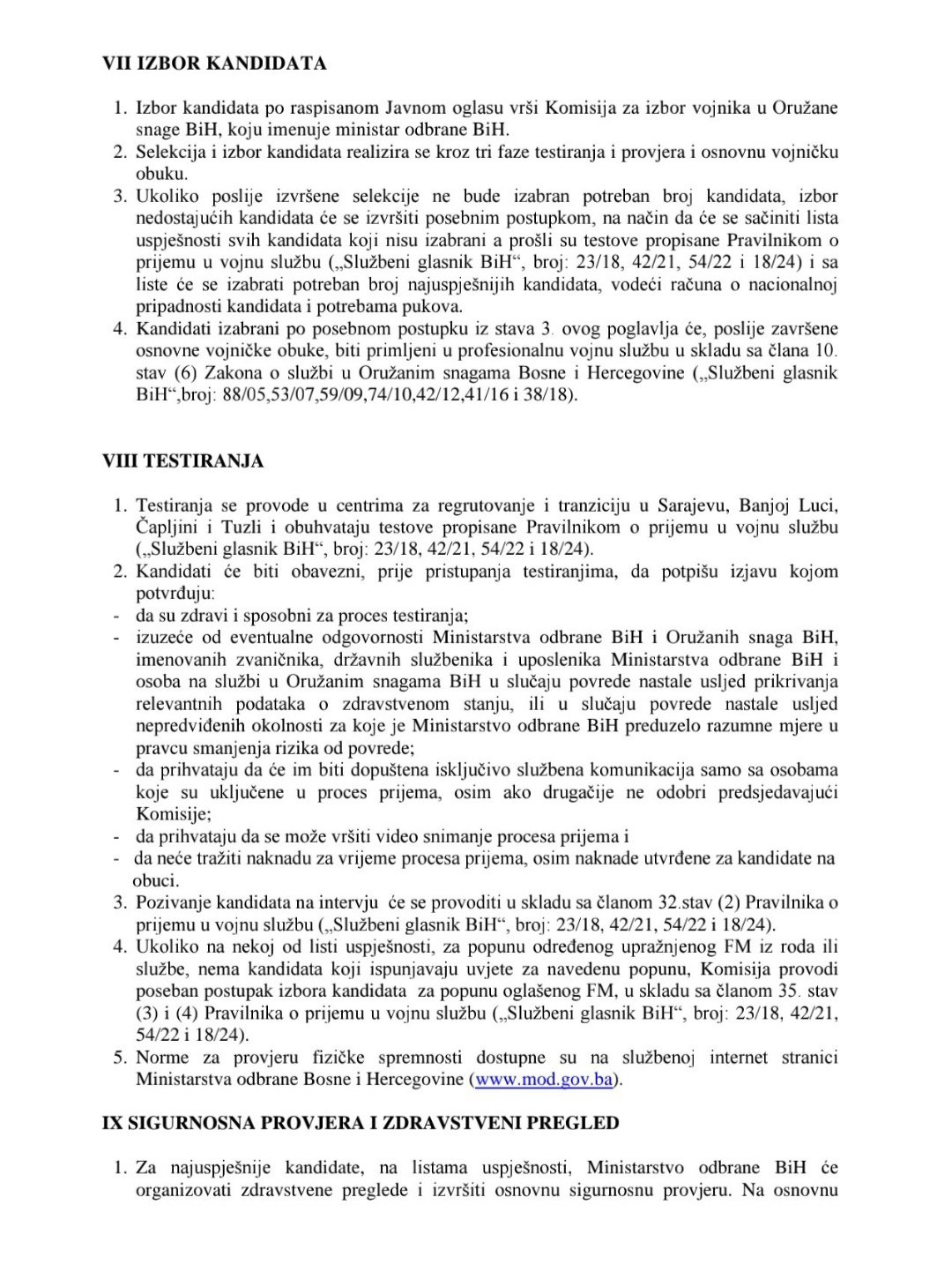 Testiranja kandidata će se obaviti u centrima za regrutovanje u: Sarajevu – kasarna „Rajlovac“, Banjoj Luci – kasarna „Kozara“, Čapljini – kasarna „Božan Šimović“ i Tuzli – vojna baza „Aerodrom Dubrave“.