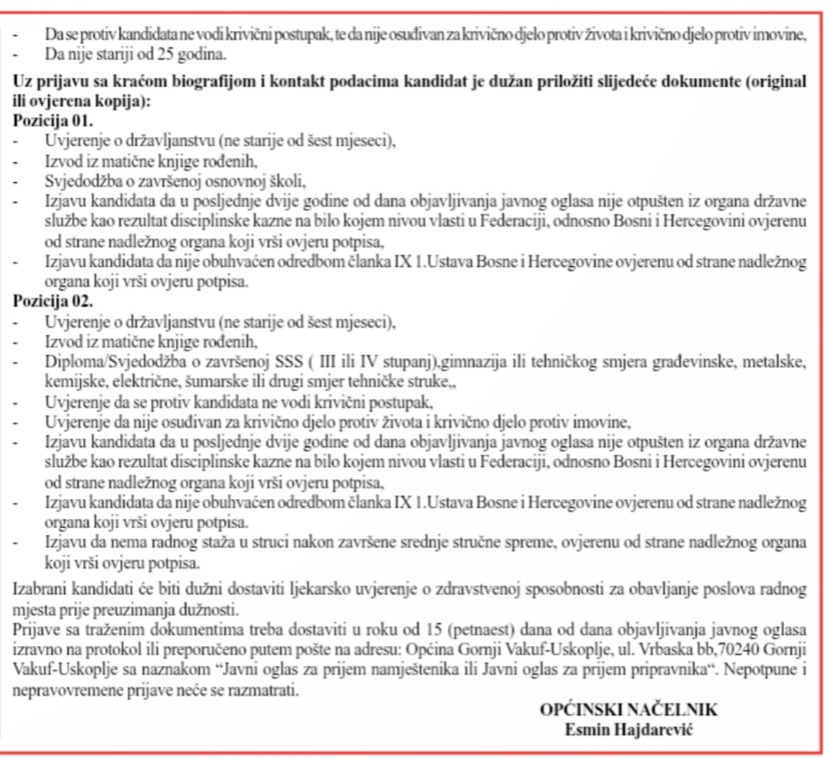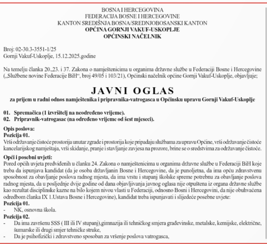 Javni oglas za prijem u radni odnos namještenika i pripravnika-vatrogasca u Općinsku upravu Gornji Vakuf-Uskoplje