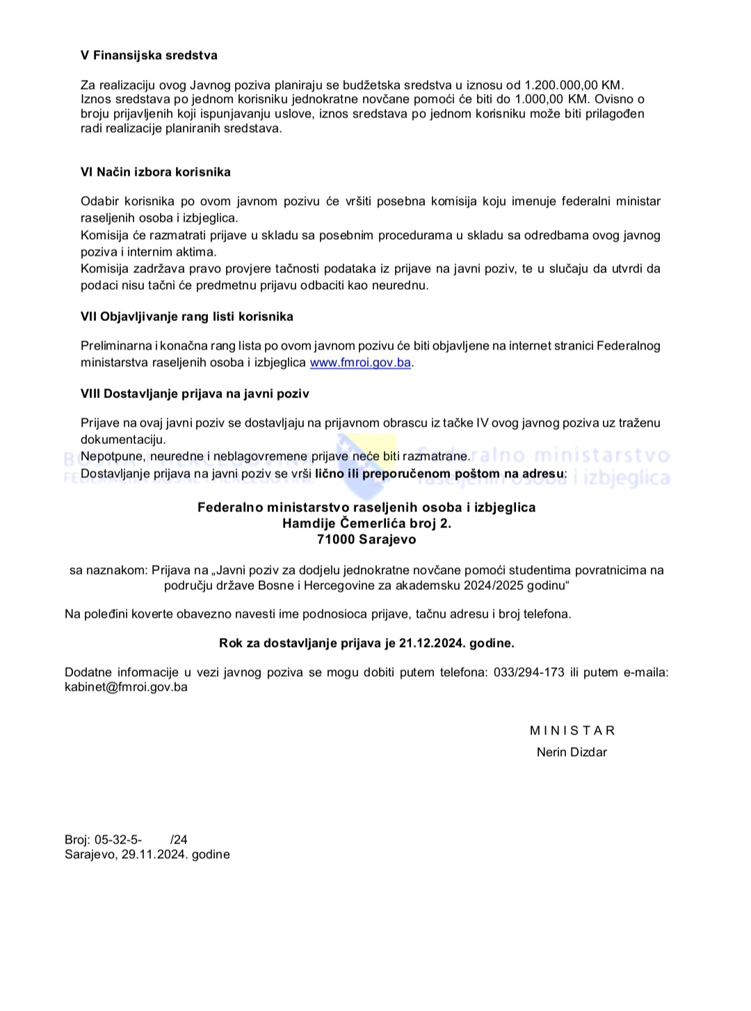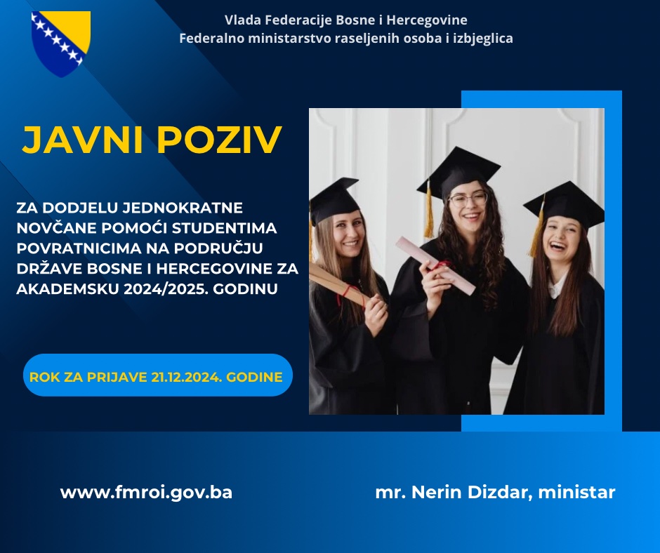 Javni poziv za dodjelu jednokratne novčane pomoći studentima povratnicima na području države BiH za akademsku 2024/2025 godinu