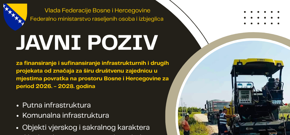 Javni poziv za finansiranje i sufinansiranje infrastrukturnih i drugih projekata od značaja za širu društvenu zajednicu u mjestima povratka na prostoru BiH za period 2026. – 2028. godina