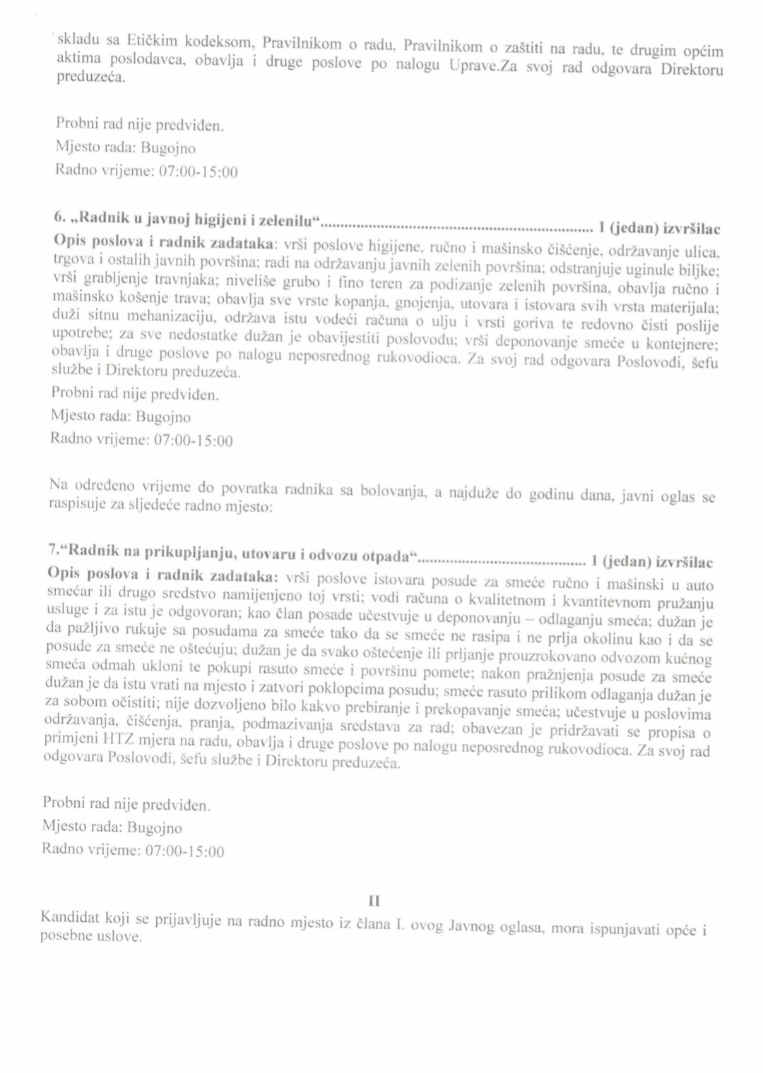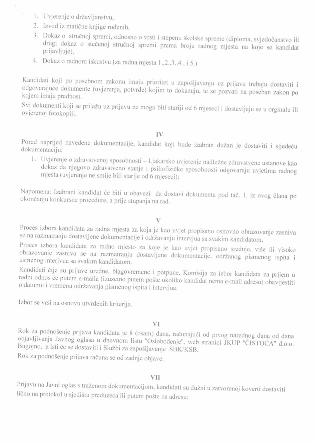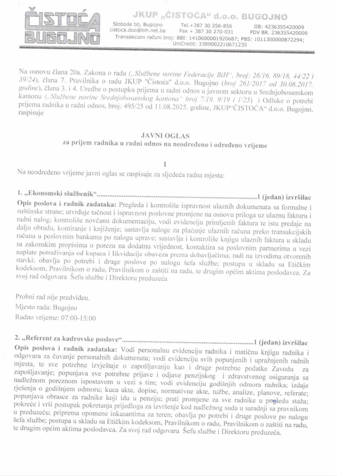 JKUP “Čistoća” d.o.o. Bugojno: Javni oglas za prijem radnika u radni odnos na neodređeno i određeno vrijeme