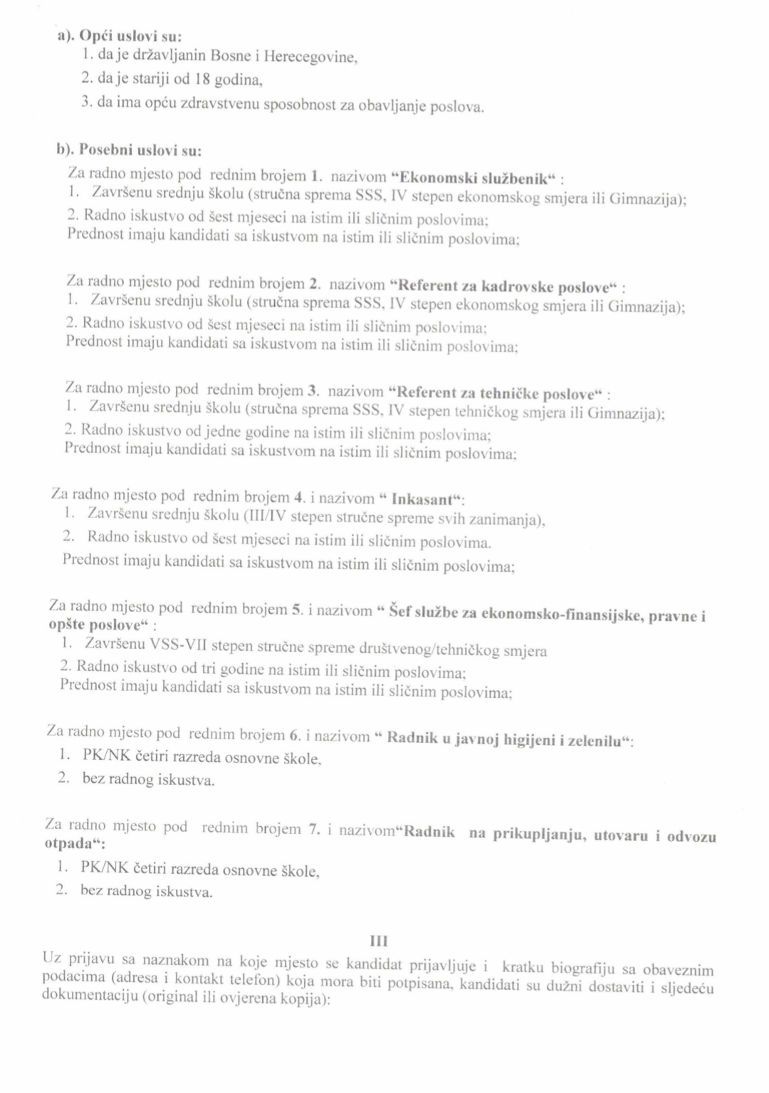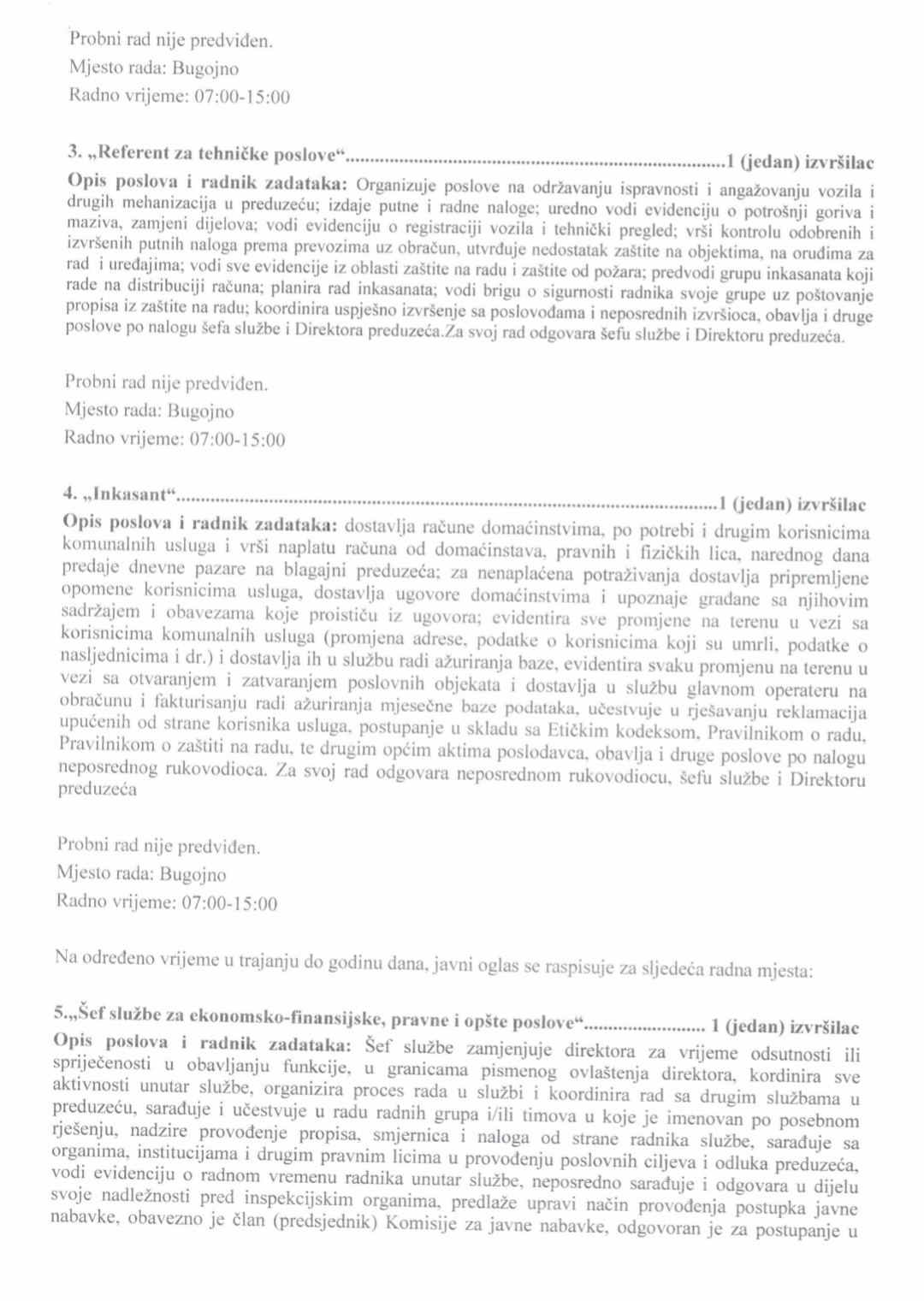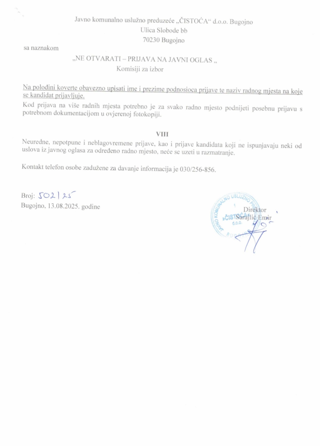 JKUP “Čistoća” d.o.o. Bugojno: Javni oglas za prijem radnika u radni odnos na neodređeno i određeno vrijeme