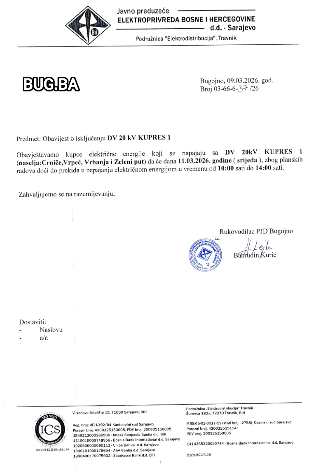 JP Elektroprivreda BiH: Obavijest o isključenju DV 20kV Kupres 1