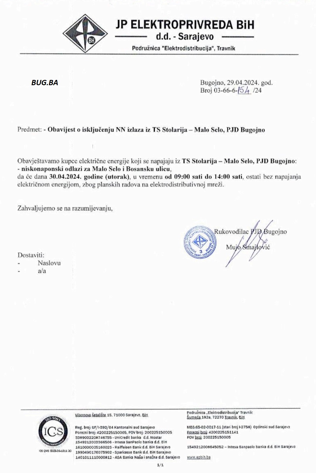 JP Elektroprivreda BiH: Obavijest o isključenju naselja Malo Selo i Bosanske ulice, PJD Bugojno