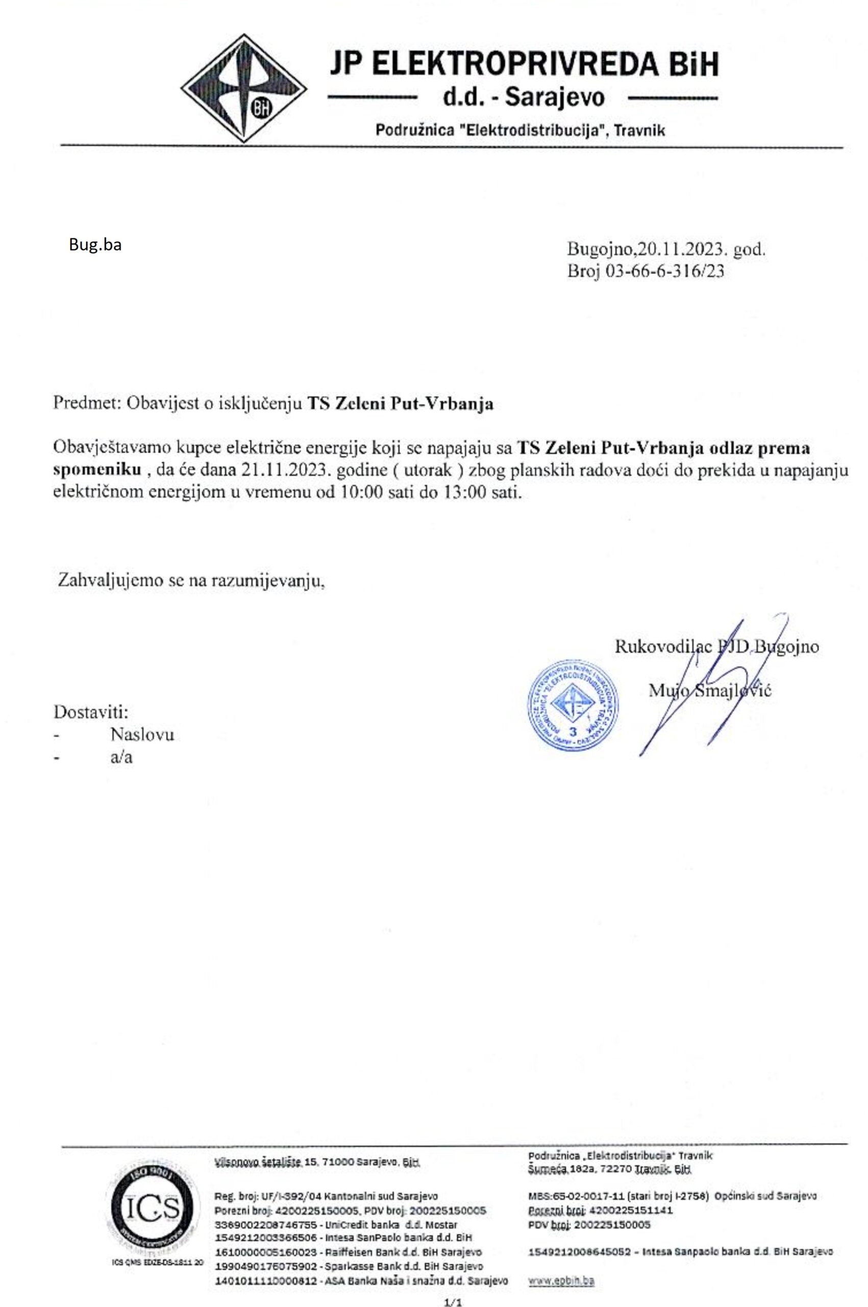 JP Elektroprivreda BiH: Obavijest o isključenju TS Zeleni put – Vrbanja