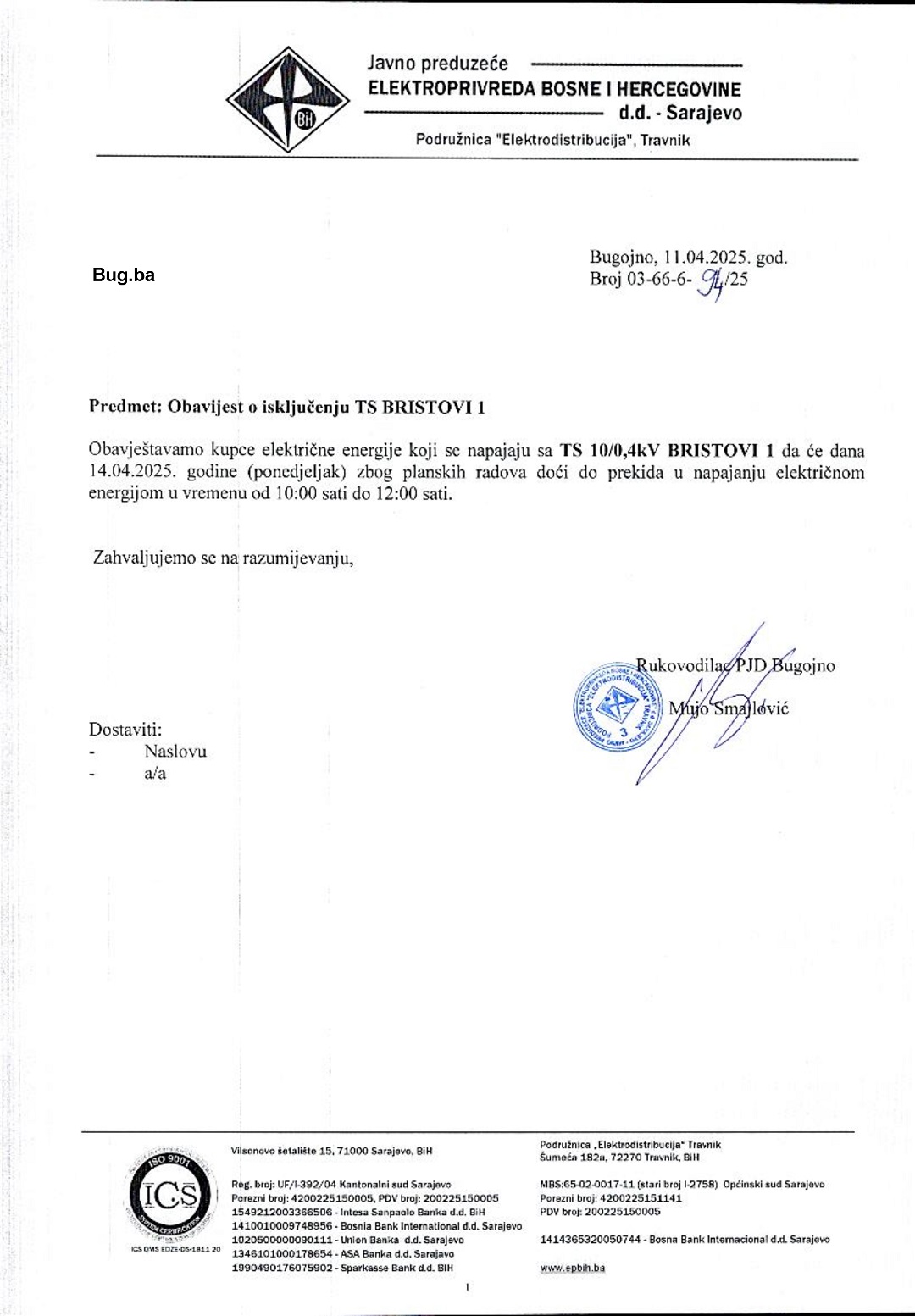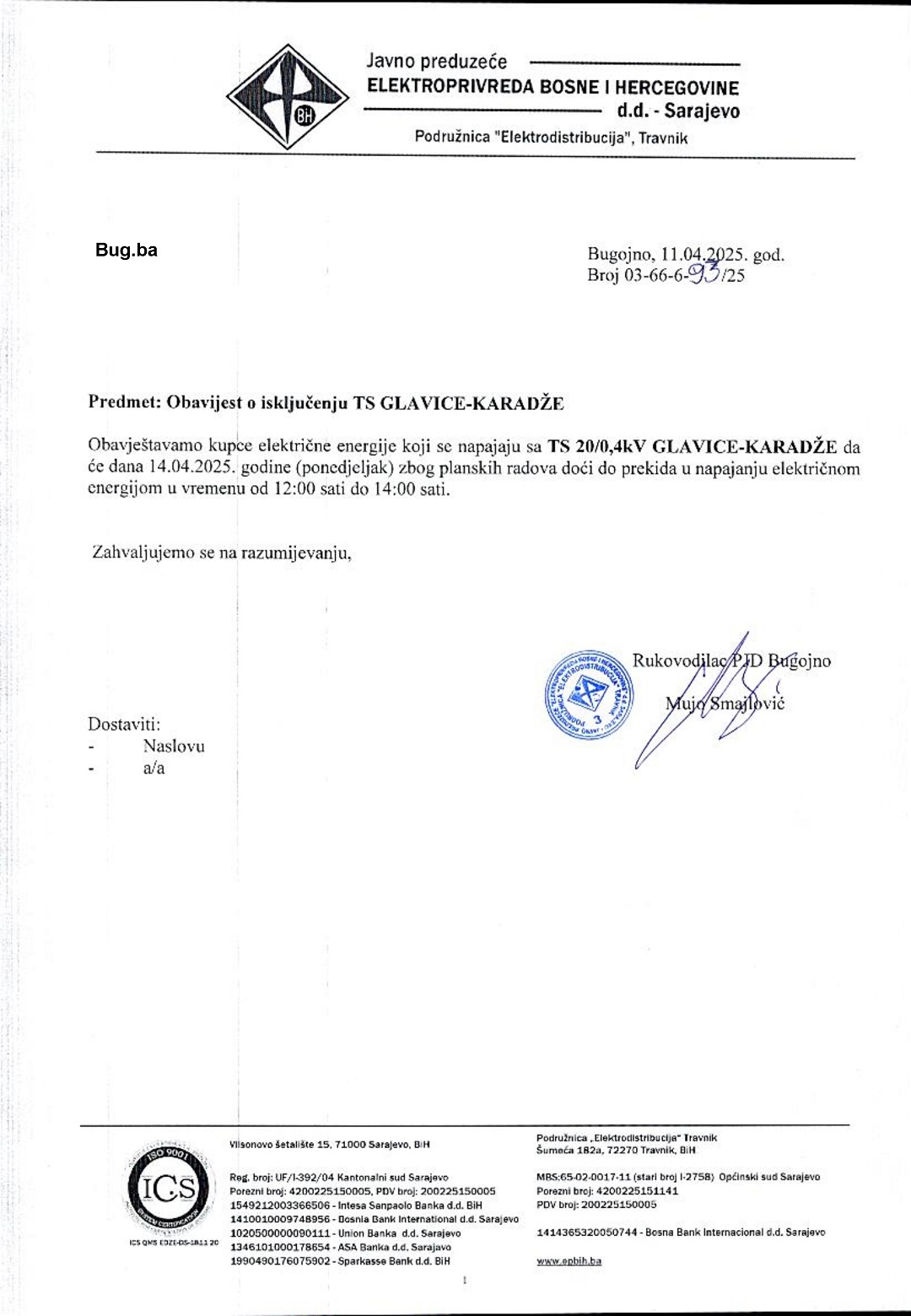 JP Elektroprivreda BiH: Obavijest o prekidu napajanja električnom energijom TS Bristovi, TS Glavice – Karadže