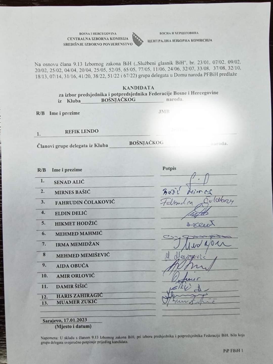 Trinaest zastupnika Kluba Bošnjaka federalnog Doma naroda zvanično su danas predložili Refika Lendu (SDA) na mjesto potpredsjednika/predsjednika Federacije Bosne i Hercegovine.