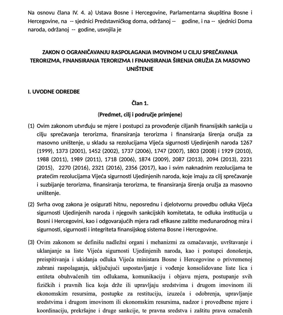 Riječ je o Nacrtu zakona o ograničavanju raspolaganja imovinom u cilju spriječavanja terorizma, finansiranja terorizma i finansiranja širenja oružja za masovno uništenje BiH. Nakon javnih konsultacija on bi trebao ići na Vijeće ministara BiH, a potom i u Parlamentarnu skupštinu BiH na usvajanje.