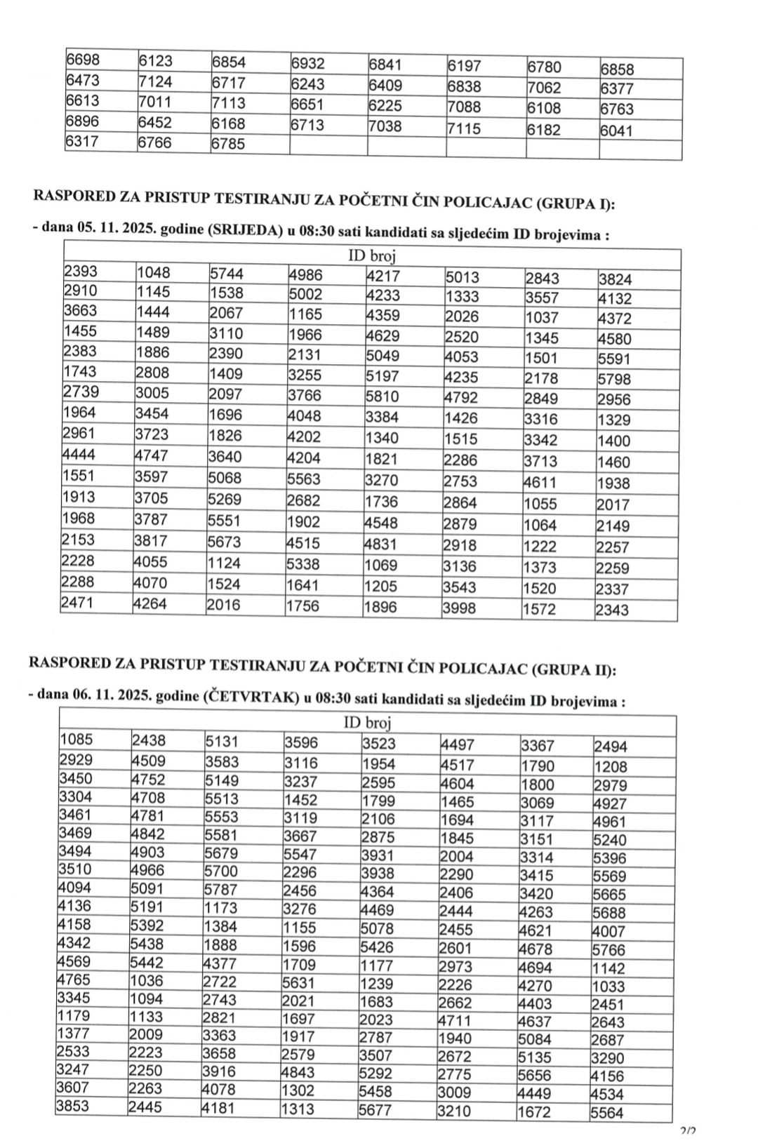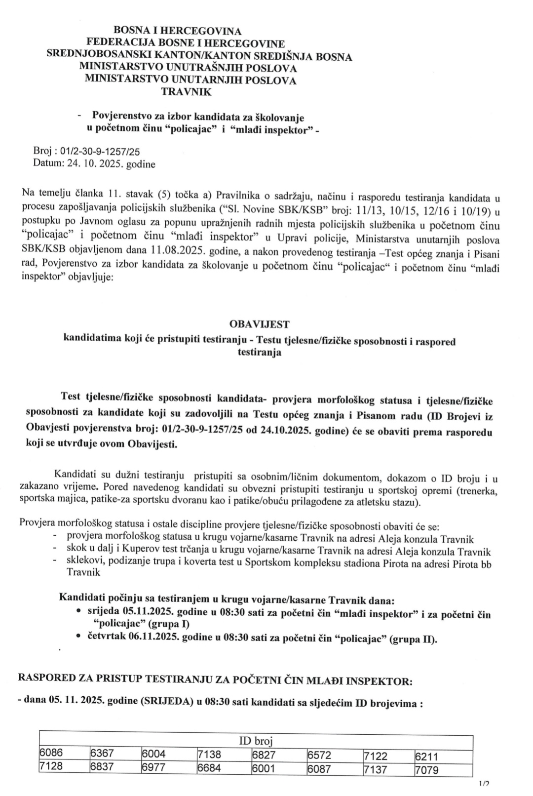 MUP SBK: Obavijest kandidatima koji će pristupiti testiranju – Testu tjelesne/fizičke sposobnosti i raspored testiranja