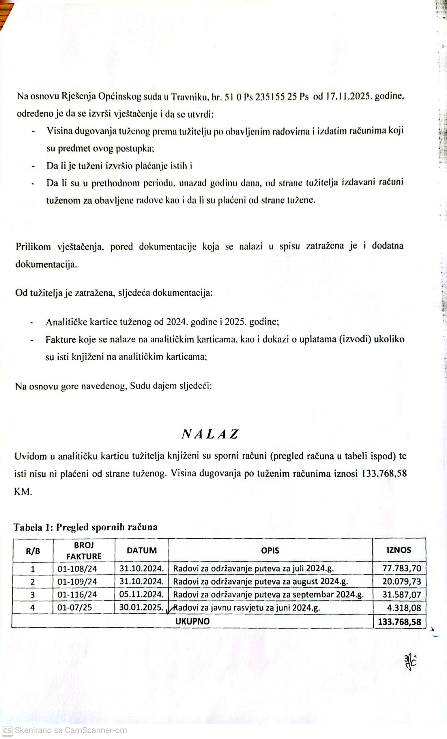 Javno preduzeće za stambeno – komunalne djelatnosti i lokalne puteve tužbom od 10. jula prošle godine traži isplatu duga od Općine Bugojno u iznosu od 133.768, 58 KM, te nadoknadu troškova parničnog postupka u iznosu od 28.621, 91 KM.