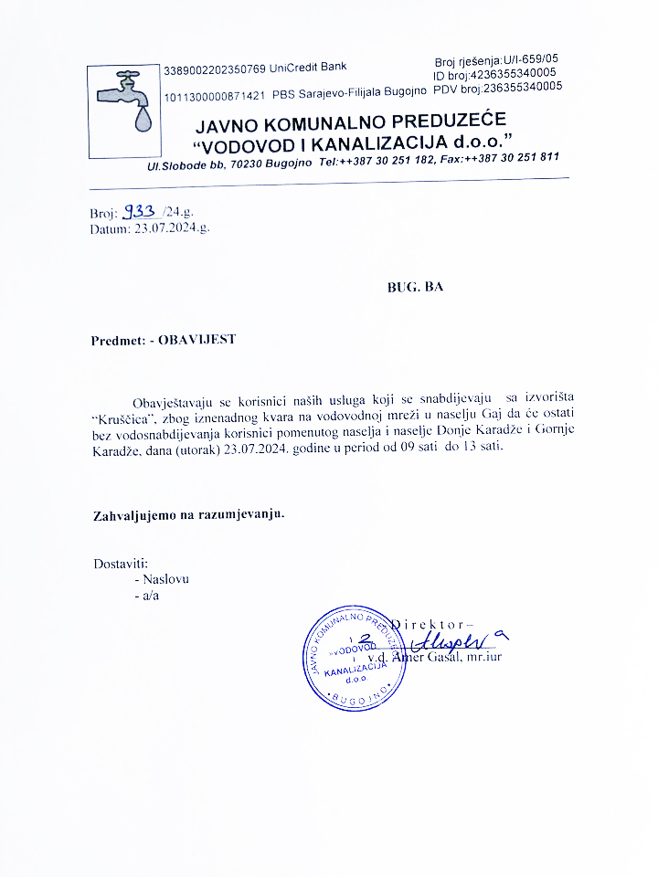 Obavijest iz Vodovoda i kanalizacije Bugojno: Iznenadan kvar na vodovodnoj mreži u naselju Gaj