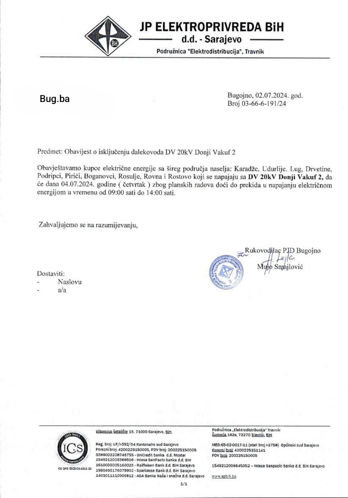 Obavijest o isključenju dalekovoda DV 20kV Donji Vakuf 2