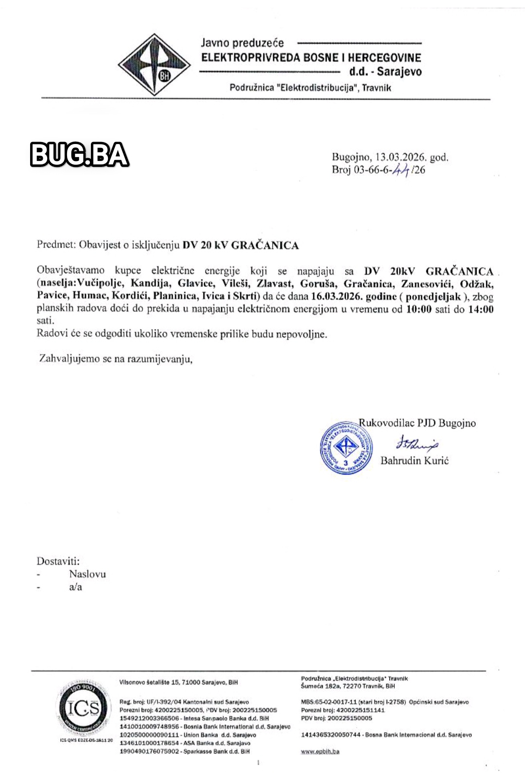 Obavijest o planiranom isključenju električne energije DV 20kV Gračanica