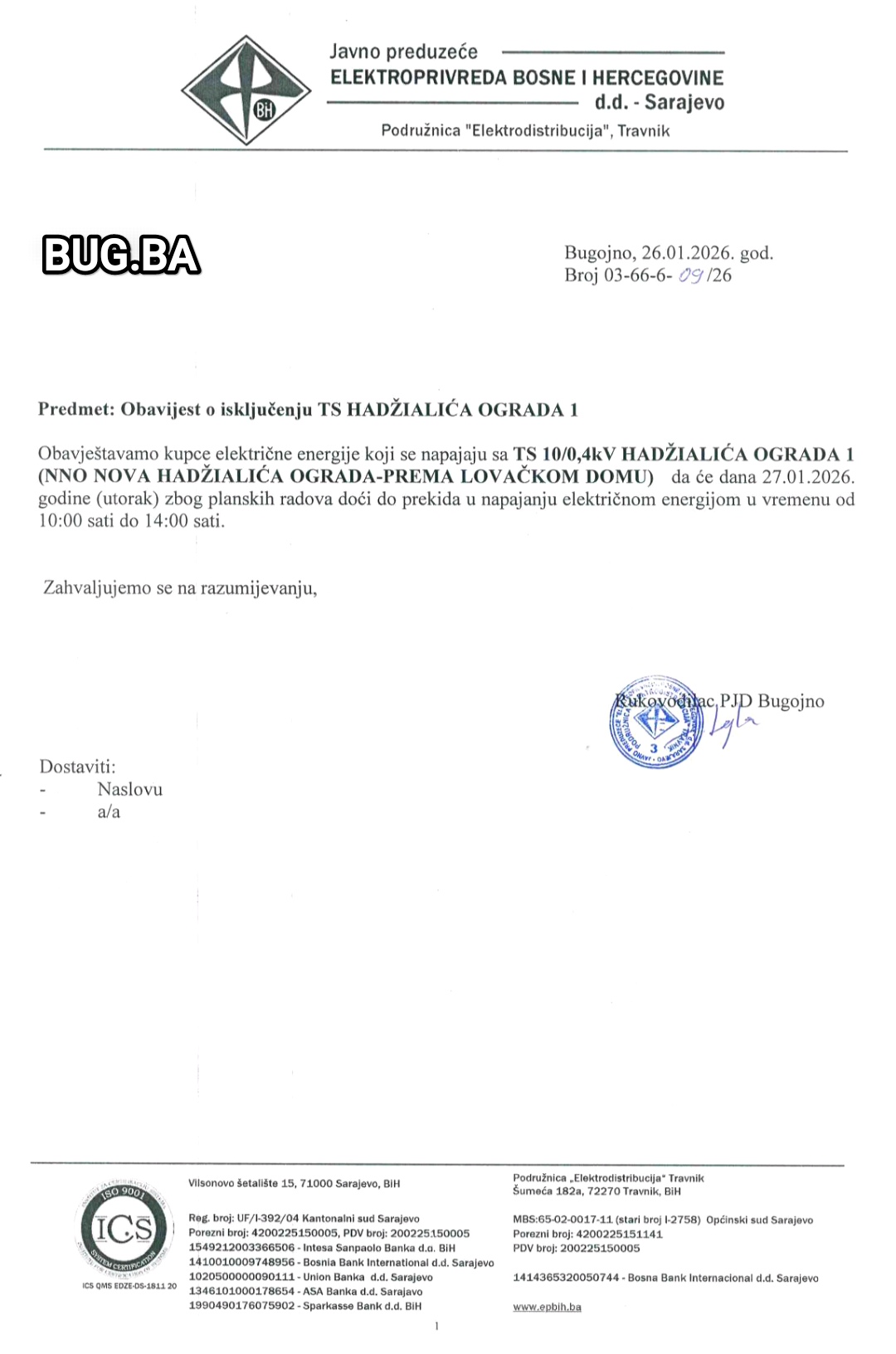 Obavijest o planiranom isključenju električne energije sa trafostanice Hadžialića ograda 1
