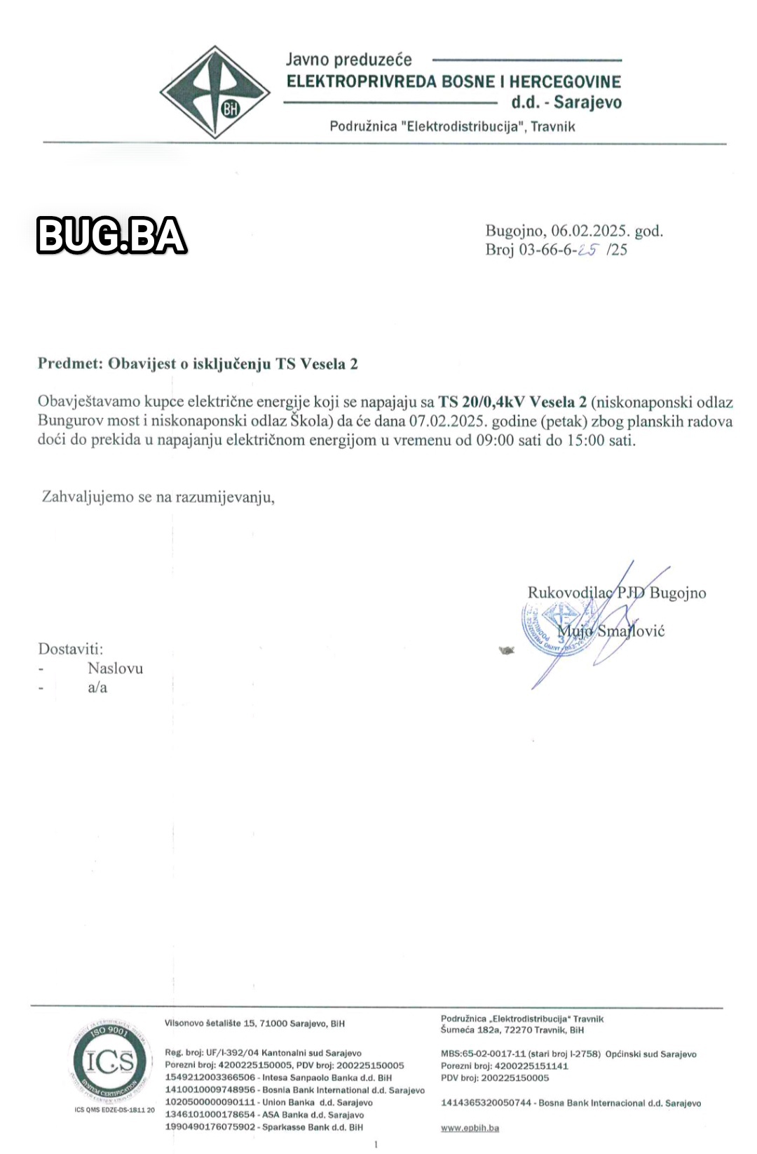 Obavijest o planiranom isključenju električne energije TS Vesela 2