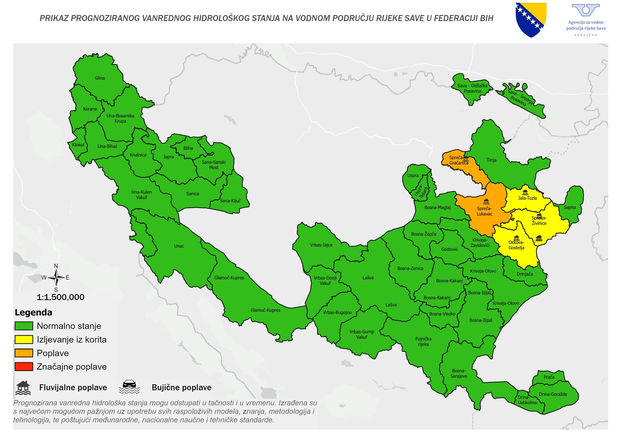 Obavještenje o prognozi vanrednog hidrološkog stanja odnosi se na područje Tuzlanskog kantona, odnosno gradove Gračanica i Lukavac i općinu Doboj Istok.