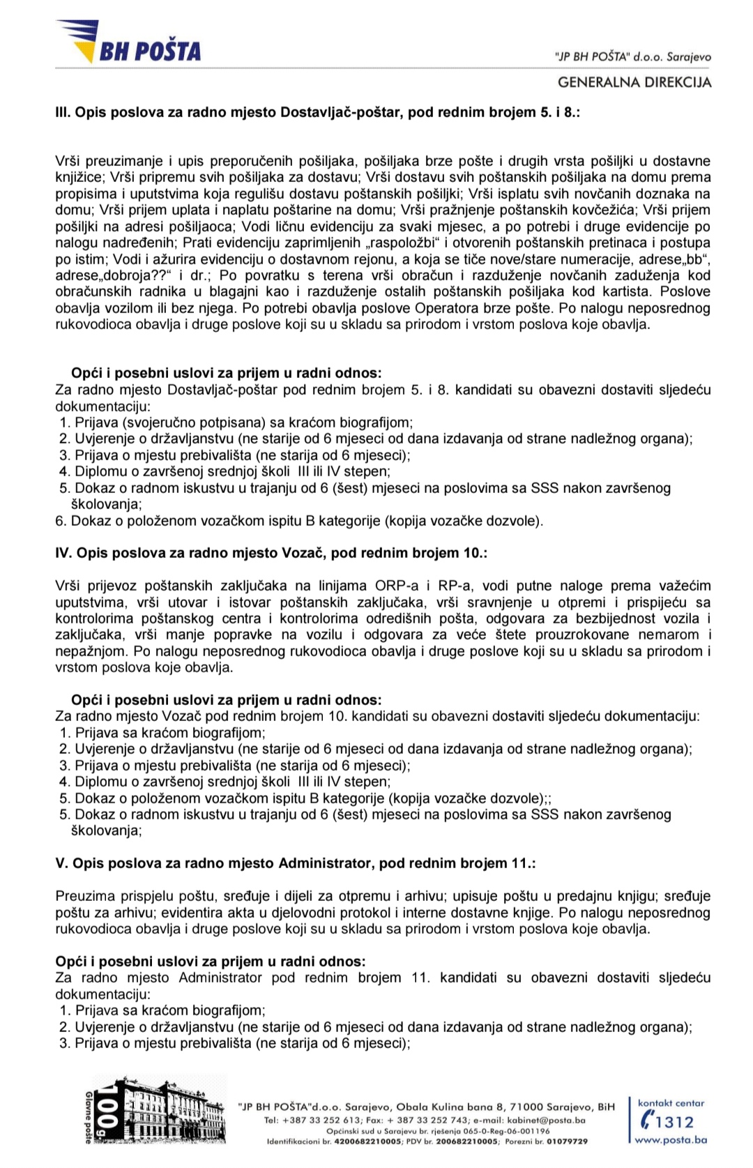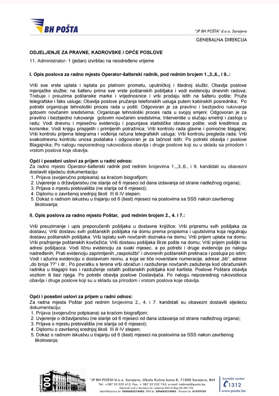Oglas za posao: JP BH Pošta u Bugojnu, Travniku, Donjem Vakufu, Gornjem Vakufu-Uskoplju, Starom Vitezu…