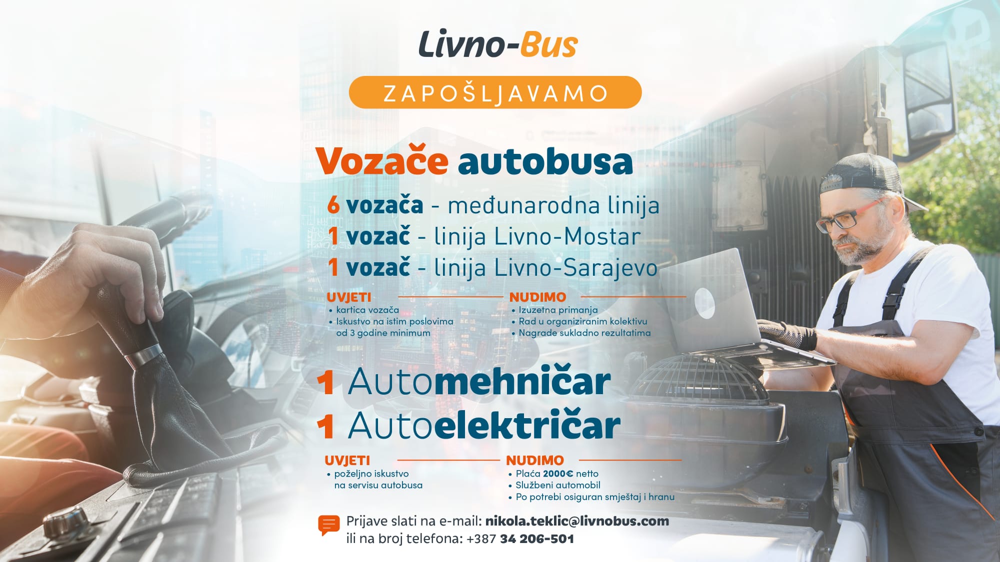 Kompanija Livno – Bus širi svoj tim pa traži nove vozače autobusa, autoelektričare i automehaničare.
