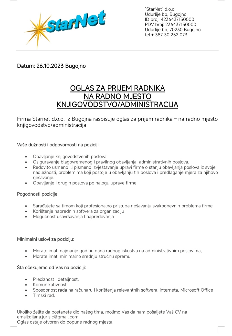 Oglas za prijem radnika u knjigovodstvu – administraciji!