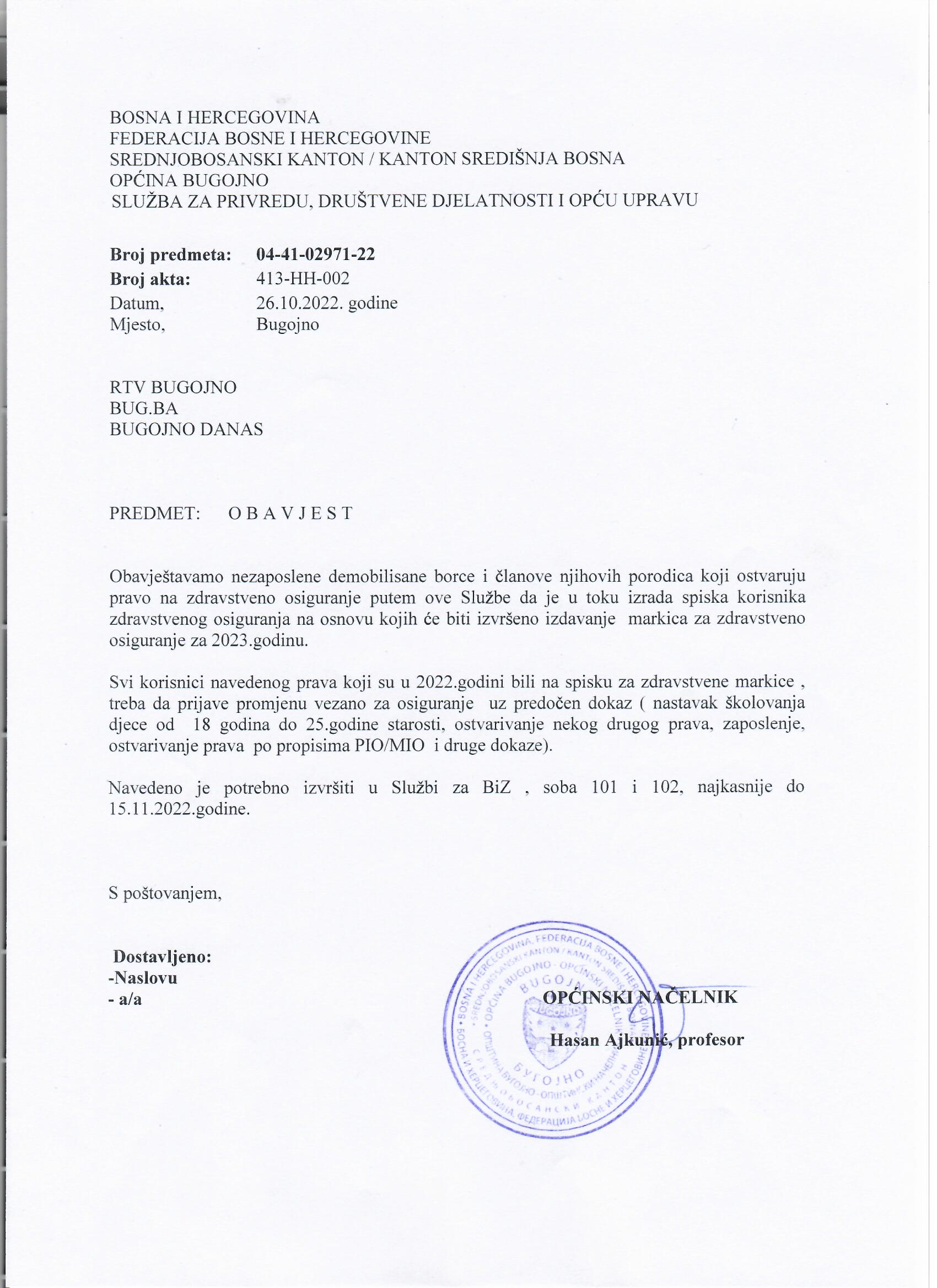 Služba za privredu, društvene djelatnosti i opću upravu Bugojno dobila ja Obavijest od Kantonalne uprave za branioce SBK da je potrebno dostaviti spiskove nezaposlenih demobilisanih boraca i članova njihovih porodica koji ostvaruju pravo na zdravstveno osiguranje, kako bi Uprava iste objedinila i dostavila Zavodu zdravstvenog osiguranja SBK ažurirane spiskove za zdravstvene markice za 2023. godinu. Rok dostave je 15.11.2022. godine što će biti konačan spisak za 2023.godinu.