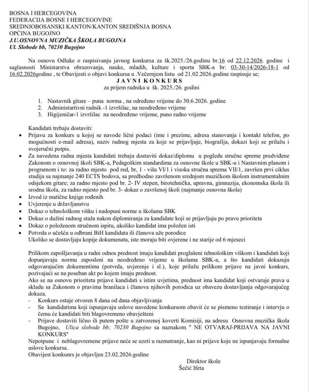 Osnovna muzička škola Bugojno: Javni konkurs za prijem radnika u šk. 2025./26. godini