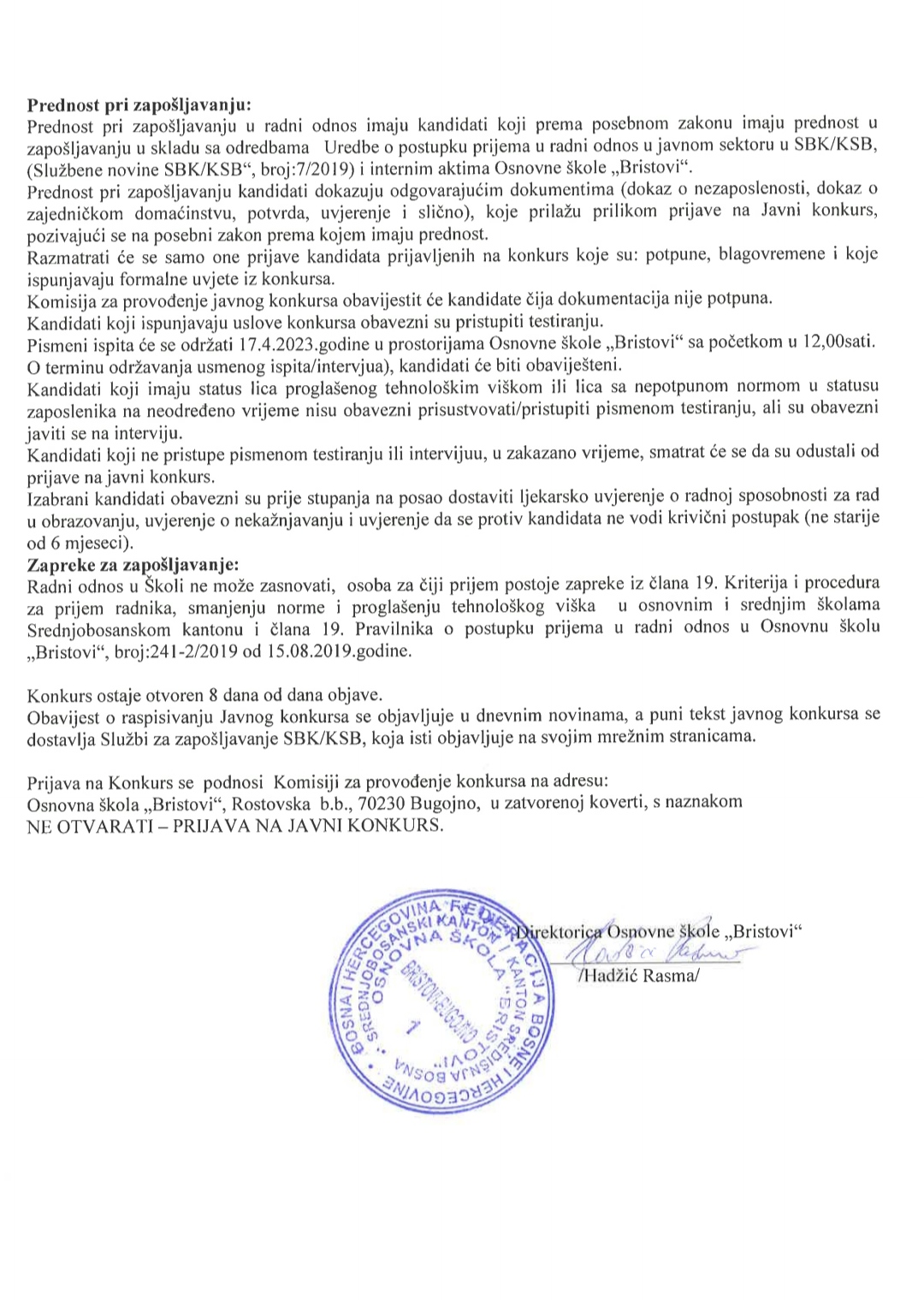Osnovna škola Bristovi: Javni konkurs za prijem u radni odnos u školskoj 2022/2023. godini