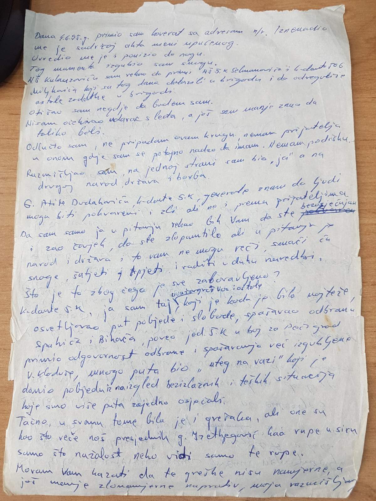 “Dana 4. 6. ‘95. primio sam koverat sa adresom: na ruke. Iznenadio me je sadržaj akta meni upućenog. Uvrijedio me je i ponizio do nogu. Tog momenta izgubio sam snagu. Načelniku štaba Kulauzoviću sam rekao da primi Načelnika štaba 5. Korpusa Selmanovića i k-danta 506. Miljkovića, koji su tog dana dolazili u brigadu i da odreguliše ostale zadatke u brigadi.