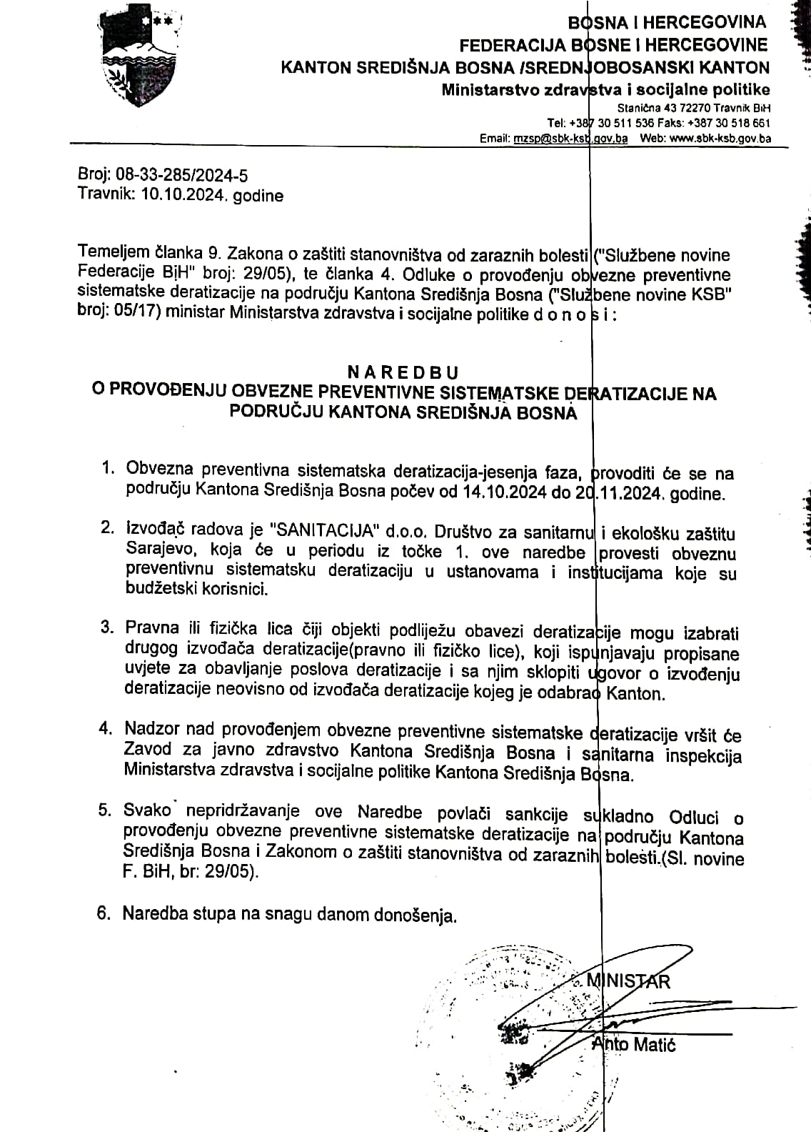 Ministarstvo zdravstva i socijalne politike SBK donosi narednu o provođenju obavezne preventivne sistemske deratizacije na području Srednjobosanskog kantona.