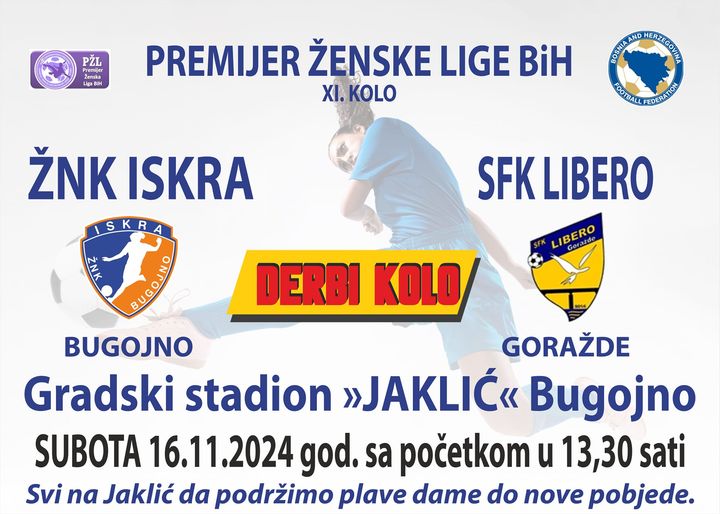 U 11. kolu Premijer nogometne lige BiH za žene igračice Iskre će u ugostiti na Jakliću ekipu SFK Libero iz Goražda. Utakmica je na rasporedu u subotu sa početkom u 13:30 sati.