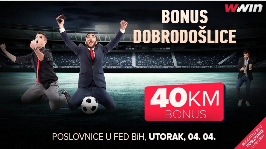Registruj se sutra (utorak, 4.4.) u poslovnicama u Federaciji BiH (Wwin-ba.com) i uzmi 40 KM i to aktivnog bonusa – keš novac ostvaren bonusom možeš isplatiti bez uslova – ODMAH) + 200% bonus na PRVU uplatu.