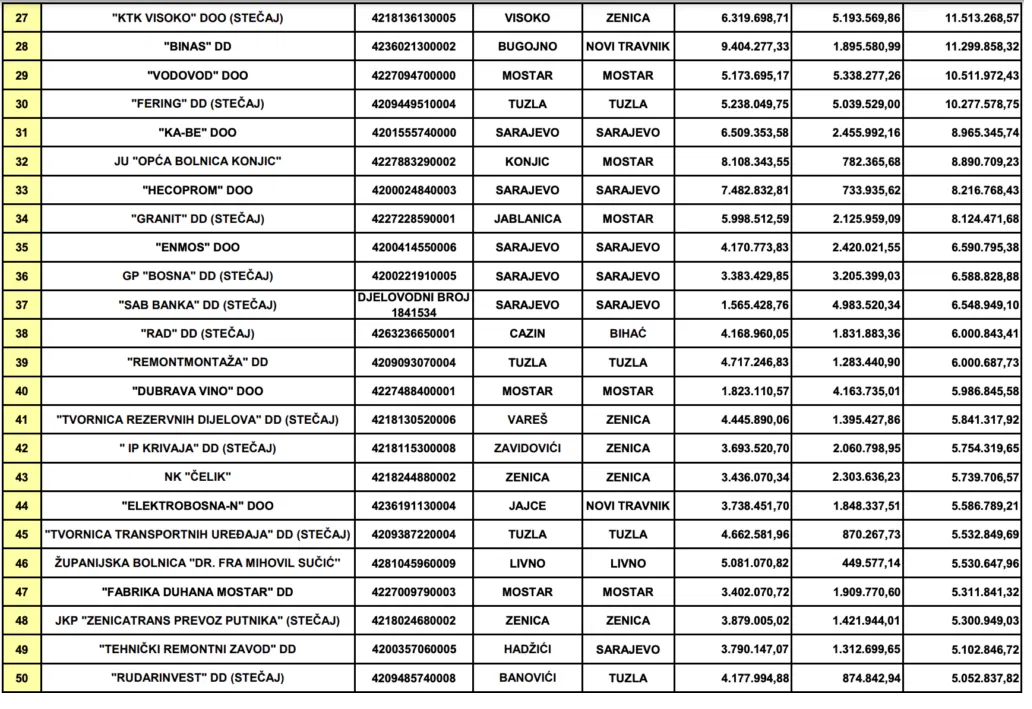 Inače, na listi je ukupno 5.109 preduzeća koja duguju ukupno 2,67 milijardi maraka, od čega su oko dvije milijarde glavnica, a ostatak se odnosi na kamate.
