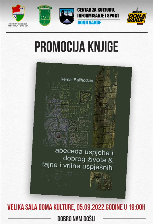 Promociju knjige Abeceda uspjeha i dobrog života & tajne i vrline uspješnih”, autora Kemala Balihodžića, organizuje JU Centar zakulturu,informisanje i sport Donji Vakuf, Općina Donji Vakuf, uz podršku Ministarstva obrazovanja, nauke, kulture, mladih i sporta SBK.