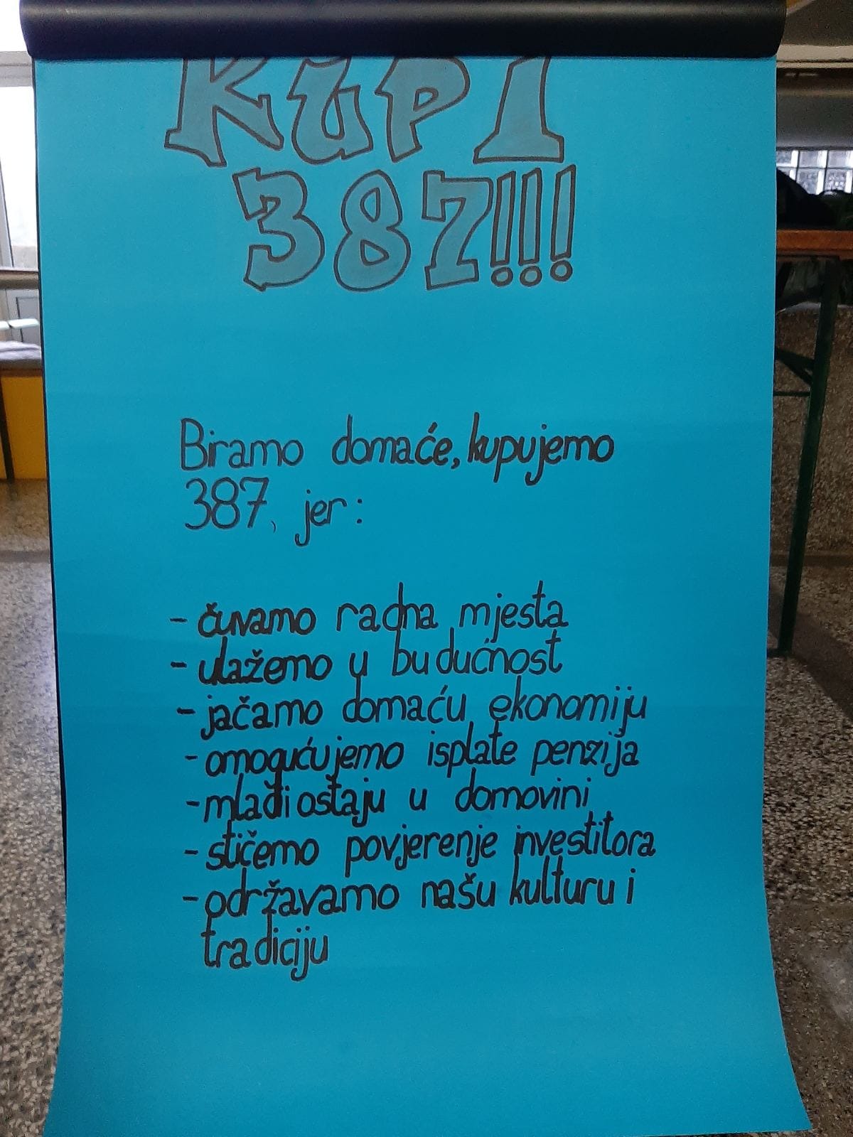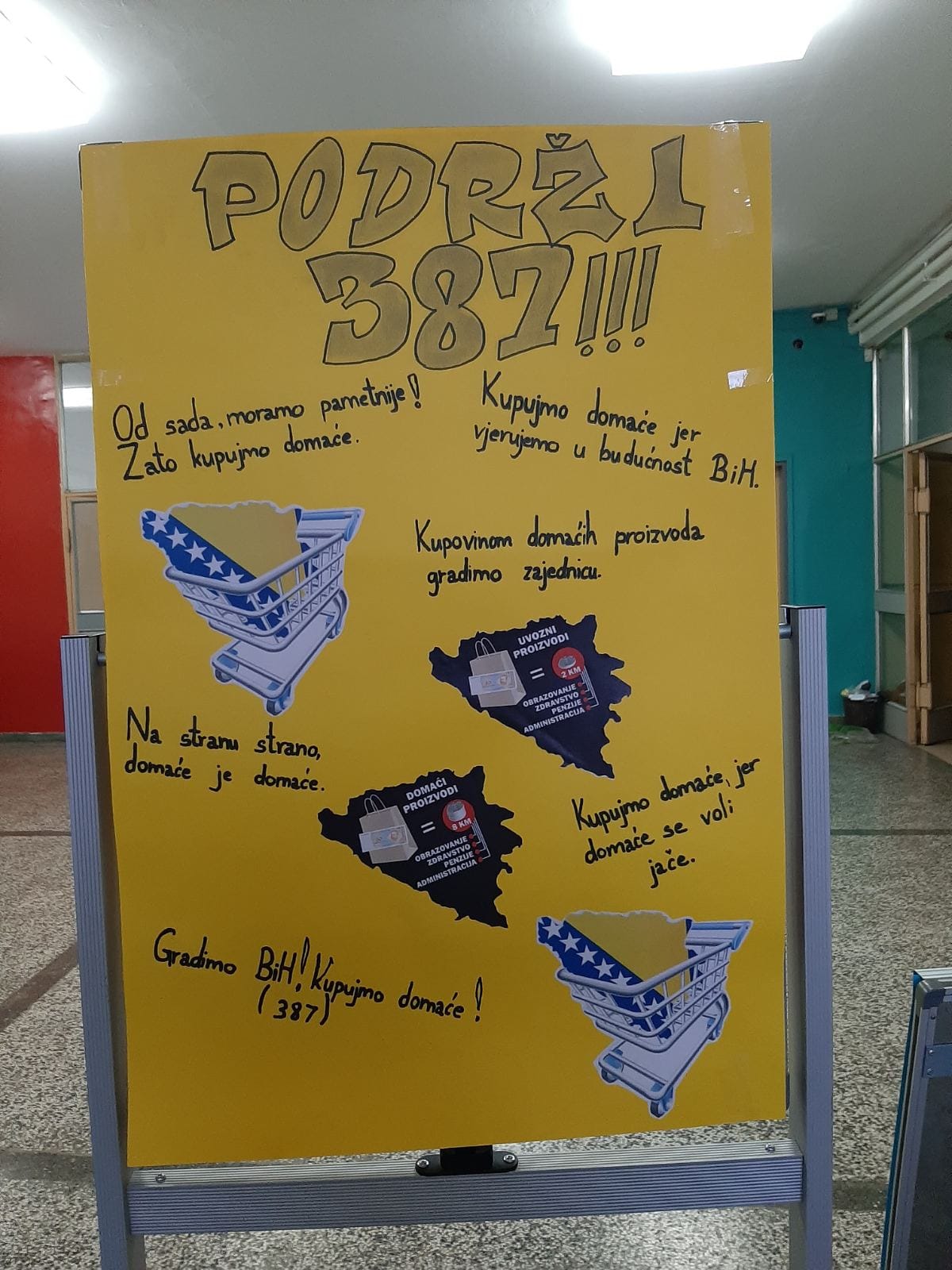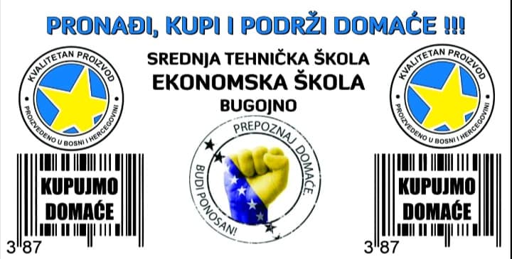 Članovi školske sekcije ,,Mladi ekonomisti” su sa prof. Vugdalić vrijedno radili na projektu ,,Pronađi,kupi i podrži domaće”. Cilj projekta je kod učenika i građana probuditi, razviti i ojačati svijest o značaju kupovine proizvoda sa kodom 387, a također i podučavanje kupaca kako bi se na policama prodajnih centara naši proizvodi što lakše uočavali, kupovali i na taj način jačala ekonomija Bosne i Hercegovine.